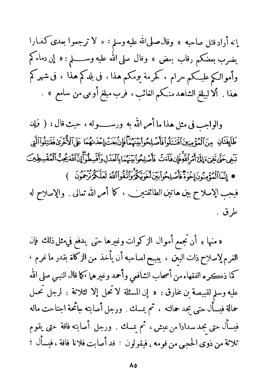 إنَّهُ أَرَادَ قَتْلَ صَاحِبِهِ} وَقَالَ صَلَّى اللَّهُ عَلَيْهِ وَسَلَّمَ {لَا تَرْجِعُوا بَعْدِي كُفَّارًا يَضْرِبُ بَعْضُكُمْ رِقَابَ بَعْضٍ} وَقَالَ صَلَّى اللَّهُ عَلَيْهِ وَسَلَّمَ {إنَّ دِمَاءَكُمْ وَأَمْوَالَكُمْ عَلَيْكُمْ حَرَامٌ، كَحُرْمَةِ يَوْمِكُمْ هَذَا، فِي بَلَدِكُمْ هَذَا، فِي شَهْرِكُمْ هَذَا. أَلَا لِيُبْلِغْ الشَّاهِدُ مِنْكُمْ الْغَائِبَ، فَرُبَّ مُبَلَّغٍ أَوْعَى مِنْ سَامِعٍ} . وَالْوَاجِبُ فِي مِثْلِ هَذَا مَا أَمَرَ اللَّهُ بِهِ وَرَسُولُهُ، حَيْثُ قَالَ: {وَإِنْ طَائِفَتَانِ مِنَ الْمُؤْمِنِينَ اقْتَتَلُوا فَأَصْلِحُوا بَيْنَهُمَا فَإِنْ بَغَتْ إحْدَاهُمَا عَلَى الْأُخْرَى فَقَاتِلُوا الَّتِي تَبْغِي حَتَّى تَفِيءَ إلَى أَمْرِ اللَّهِ فَإِنْ فَاءَتْ فَأَصْلِحُوا بَيْنَهُمَا بِالْعَدْلِ وَأَقْسِطُوا إنَّ اللَّهَ يُحِبُّ الْمُقْسِطِينَ} {إنَّمَا الْمُؤْمِنُونَ إخْوَةٌ فَأَصْلِحُوا بَيْنَ أَخَوَيْكُمْ وَاتَّقُوا اللَّهَ لَعَلَّكُمْ تُرْحَمُونَ} فَيَجِبُ الْإِصْلَاحُ بَيْنَ هَاتَيْنِ الطَّائِفَتَيْنِ، كَمَا أَمَرَ اللَّهُ تَعَالَى. وَالْإِصْلَاحُ لَهُ طُرُقٌ. " مِنْهَا " أَنْ تُجْمَعَ أَمْوَالُ الزَّكَوَاتِ وَغَيْرُهَا حَتَّى يُدْفَعَ فِي مِثْلِ ذَلِك فَإِنَّ الْغُرْمَ لِإِصْلَاحِ ذَاتِ الْبَيْنِ، يُبِيحُ لِصَاحِبِهِ أَنْ يَأْخُذَ مِنْ الزَّكَاةِ بِقَدْرِ مَا غَرِمَ، كَمَا ذَكَرَهُ الْفُقَهَاءُ مِنْ أَصْحَابِ الشَّافِعِيِّ وَأَحْمَد وَغَيْرِهِمَا، كَمَا {قَالَ النَّبِيُّ صَلَّى اللَّهُ عَلَيْهِ وَسَلَّمَ لقبيصة بْنِ مخارق: إنَّ الْمَسْأَلَةَ لَا تَحِلُّ إلَّا لِثَلَاثَةِ: لِرَجُلِ تَحَمَّلَ حَمَالَةً فَيَسْأَلُ حَتَّى يَجِدَ حَمَالَتَهُ، ثُمَّ يُمْسِكُ. وَرَجُلٍ أَصَابَتْهُ جَائِحَةٌ اجْتَاحَتْ مَالَهُ فَيَسْأَلُ حَتَّى يَجِدَ سَدَادًا مِنْ عَيْشٍ، ثُمَّ يُمْسِكُ. وَرَجُلٌ أَصَابَتْهُ فَاقَةٌ حَتَّى يَقُومَ ثَلَاثَةٌ مِنْ ذَوِي الحجى مِنْ قَوْمِهِ، فَيَقُولُونَ: قَدْ أَصَابَتْ فُلَانًا فَاقَةٌ، فَيَسْأَلُ؛