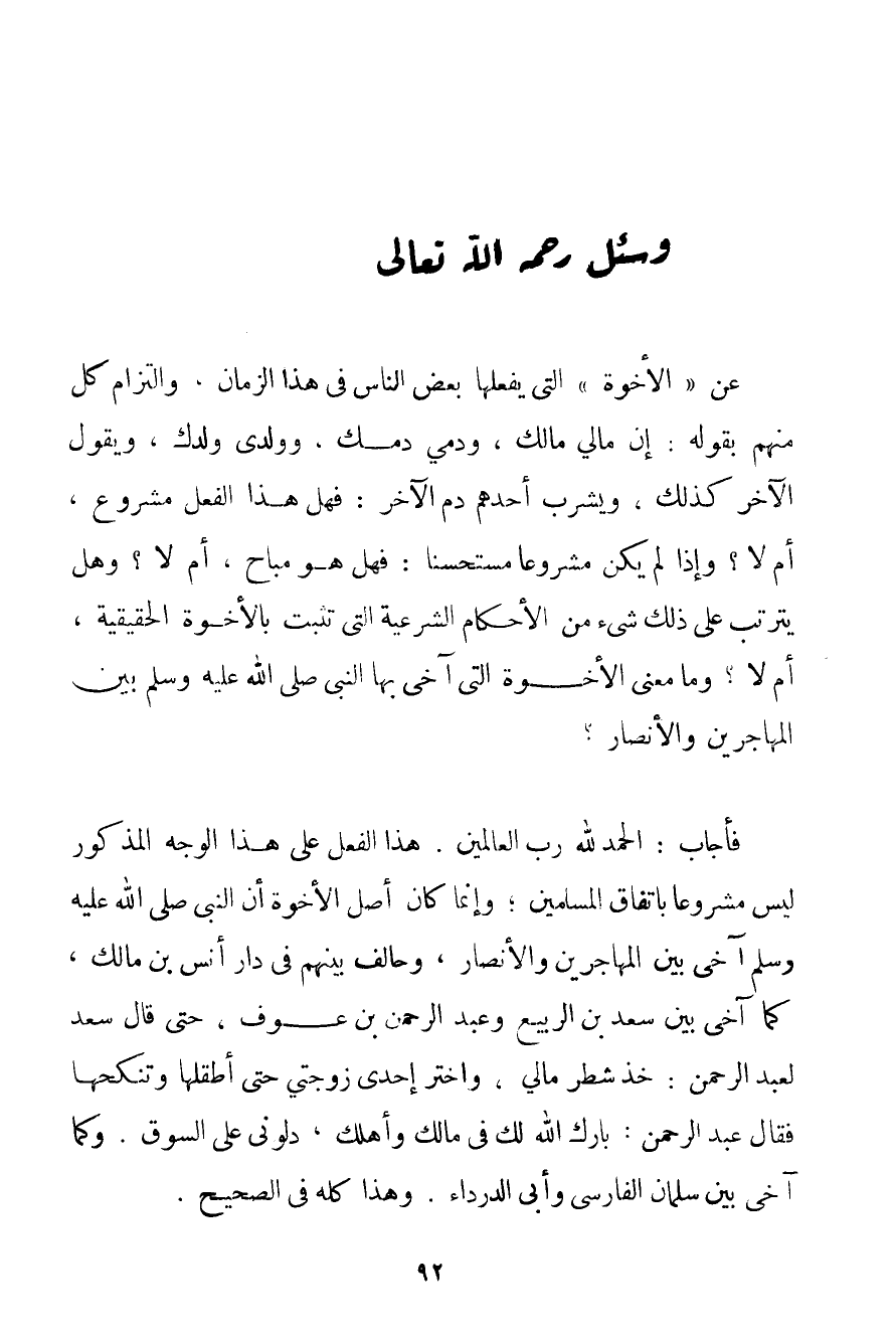 الْحَمْدُ لِلَّهِ رَبِّ الْعَالَمِينَ، هَذَا الْفِعْلُ عَلَى هَذَا الْوَجْهِ الْمَذْكُورِ لَيْسَ مَشْرُوعًا بِاتِّفَاقِ الْمُسْلِمِينَ؛ وَإِنَّمَا كَانَ أَصْلُ الْأُخُوَّةِ أَنَّ النَّبِيَّ صَلَّى اللَّهُ عَلَيْهِ وَسَلَّمَ آخَى بَيْنَ الْمُهَاجِرِينَ وَالْأَنْصَارِ، وَحَالَفَ بَيْنَهُمْ فِي دَارِ أَنَسِ بْنِ مَالِكٍ، كَمَا آخَى بَيْنَ سَعْدِ بْنِ الرَّبِيعِ وَعَبْدِ الرَّحْمَنِ بْنِ عَوْفٍ، حَتَّى قَالَ سَعْدٌ لِعَبْدِ الرَّحْمَنِ: خُذْ شَطْرَ مَالِي، وَاخْتَرْ إحْدَى زَوْجَتَيَّ حَتَّى أُطَلِّقَهَا وَتَنْكِحَهَا فَقَالَ عَبْدُ الرَّحْمَنِ: بَارَكَ اللَّهُ لَك فِي مَالِكِ وَأَهْلِك، دُلُّونِي عَلَى السُّوقِ. وَكَمَا آخَى بَيْنَ سَلْمَانَ الْفَارِسِيِّ وَأَبِي الدَّرْدَاءِ. وَهَذَا كُلُّهُ فِي الصَّحِيحِ.