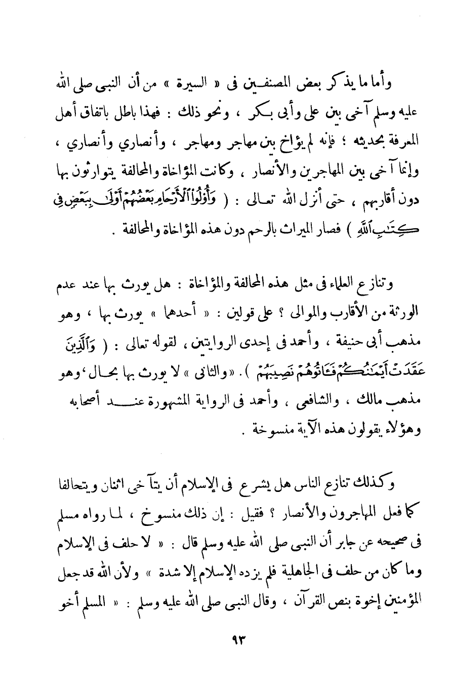 وَأَمَّا مَا يَذْكُرُ بَعْضُ الْمُصَنِّفِينَ فِي " السِّيرَةِ " مِنْ أَنَّ النَّبِيَّ صَلَّى اللَّهُ عَلَيْهِ وَسَلَّمَ آخَى بَيْنَ عَلِيٍّ وَأَبِي بَكْرٍ، وَنَحْوَ ذَلِكَ: فَهَذَا بَاطِلٌ بِاتِّفَاقِ أَهْلِ الْمَعْرِفَةِ بِحَدِيثِهِ؛ فَإِنَّهُ لَمْ يُؤَاخِ بَيْنَ مُهَاجِرٍ وَمُهَاجِرٍ، وَأَنْصَارِيٍّ وَأَنْصَارِيٍّ، وَإِنَّمَا آخَى بَيْنَ الْمُهَاجِرِينَ وَالْأَنْصَارِ، وَكَانَتْ الْمُؤَاخَاةُ وَالْمُحَالَفَةُ يَتَوَارَثُونَ بِهَا دُونَ أَقَارِبِهِمْ، حَتَّى أَنْزَلَ اللَّهُ تَعَالَى: {وَأُولُو الْأَرْحَامِ بَعْضُهُمْ أَوْلَى بِبَعْضٍ فِي كِتَابِ اللَّهِ} فَصَارَ الْمِيرَاثُ بِالرَّحِمِ دُونَ هَذِهِ الْمُؤَاخَاةِ وَالْمُحَالَفَةِ. وَتَنَازَعَ الْعُلَمَاءُ فِي مِثْلِ هَذِهِ الْمُحَالَفَةِ وَالْمُؤَاخَاةِ: هَلْ يُورَثُ بِهَا عِنْدَ عَدِمِ الْوَرَثَةِ مِنْ الْأَقَارِبِ وَالْمَوَالِي؟ عَلَى قَوْلَيْنِ: " أَحَدُهُمَا " يُورَثُ بِهَا، وَهُوَ مَذْهَبُ أَبِي حَنِيفَةَ، وَأَحْمَد فِي إحْدَى الرِّوَايَتَيْنِ، لِقَوْلِهِ تَعَالَى {وَالَّذِينَ عَقَدَتْ أَيْمَانُكُمْ فَآتُوهُمْ نَصِيبَهُمْ} . " وَالثَّانِي " لَا يُورَثُ بِهَا بِحَالِ، وَهُوَ مَذْهَبُ مَالِكٍ، وَالشَّافِعِيِّ، وَأَحْمَد فِي الرِّوَايَةِ الْمَشْهُورَةِ عِنْدَ أَصْحَابِهِ وَهَؤُلَاءِ يَقُولُونَ هَذِهِ الْآيَةُ مَنْسُوخَةٌ. وَكَذَلِكَ تَنَازَعَ النَّاسُ هَلْ يُشْرَعُ فِي الْإِسْلَامِ أَنْ يَتَآخَى اثْنَانِ وَيَتَحَالَفَا كَمَا فَعَلَ الْمُهَاجِرُونَ وَالْأَنْصَارُ؟ فَقِيلَ: إنَّ ذَلِكَ مَنْسُوخٌ، لِمَا رَوَاهُ مُسْلِمٌ فِي صَحِيحِهِ عَنْ جَابِرٍ أَنَّ النَّبِيَّ صَلَّى اللَّهُ عَلَيْهِ وَسَلَّمَ قَالَ: {لَا حِلْفَ فِي الْإِسْلَامِ وَمَا كَانَ مِنْ حِلْفٍ فِي الْجَاهِلِيَّةِ فَلَمْ يَزِدْهُ الْإِسْلَامُ إلَّا شِدَّةً} وَلِأَنَّ اللَّهَ قَدْ جَعَلَ الْمُؤْمِنِينَ إخْوَةً بِنَصِّ الْقُرْآنِ، وَقَالَ النَّبِيُّ صَلَّى اللَّهُ عَلَيْهِ وَسَلَّمَ {الْمُسْلِمُ أَخُو