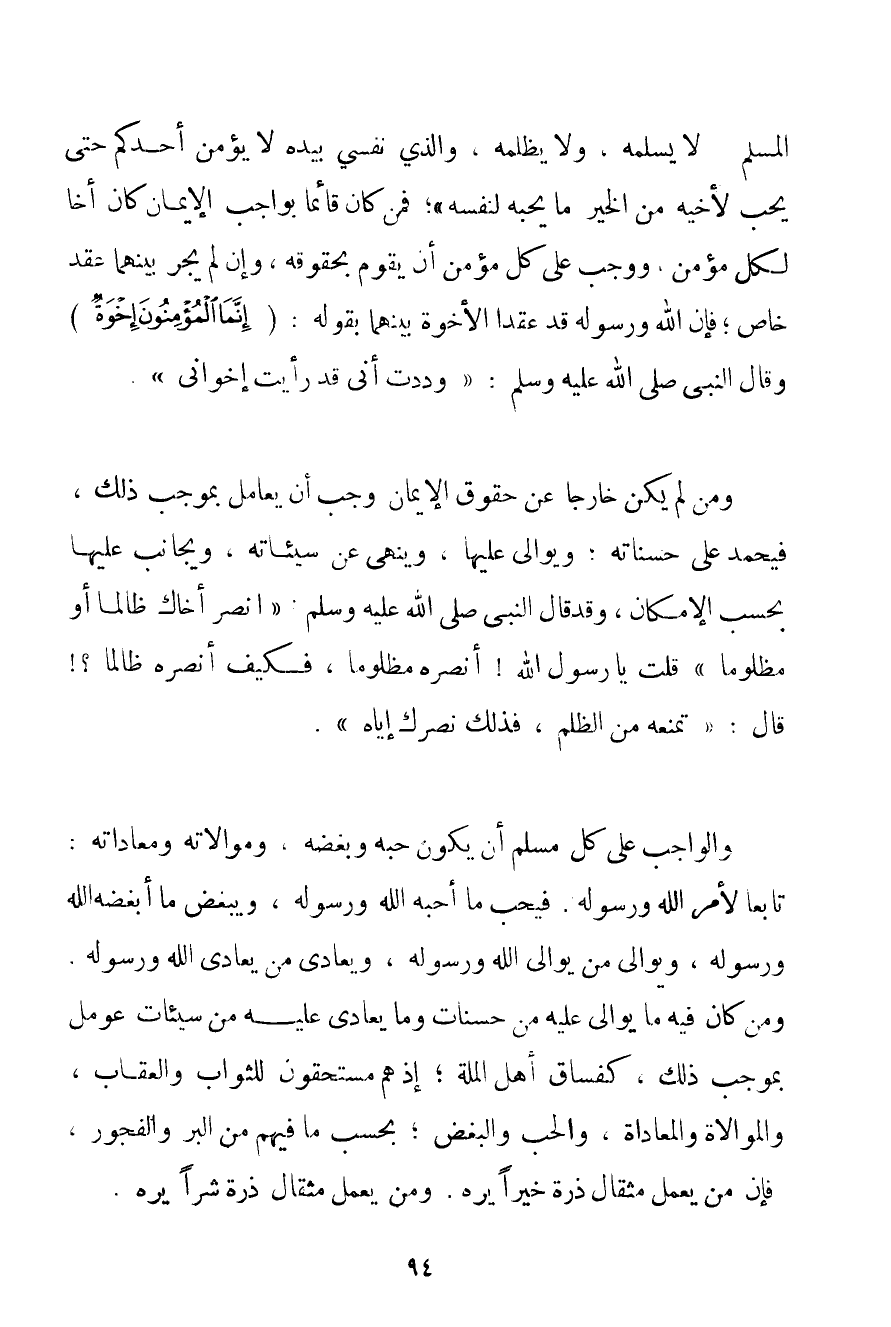 الْمُسْلِمِ لَا يُسْلِمْهُ، وَلَا يَظْلِمْهُ، وَاَلَّذِي نَفْسِي بِيَدِهِ لَا يُؤْمِنُ أَحَدُكُمْ حَتَّى يُحِبَّ لِأَخِيهِ مِنْ الْخَيْرِ مَا يُحِبُّهُ لِنَفْسِهِ} فَمَنْ كَانَ قَائِمًا بِوَاجِبِ الْإِيمَانِ كَانَ أَخًا لِكُلِّ مُؤْمِنٍ، وَوَجَبَ عَلَى كُلِّ مُؤْمِنٍ أَنْ يَقُومَ بِحُقُوقِهِ، وَإِنْ لَمْ يَجْرِ بَيْنَهُمَا عَقْدٌ خَاصٌّ؛ فَإِنَّ اللَّهَ وَرَسُولَهُ قَدْ عَقَدَا الْأُخُوَّةَ بَيْنَهُمَا بِقَوْلِهِ: {إنَّمَا الْمُؤْمِنُونَ إخْوَةٌ} وَقَالَ النَّبِيُّ صَلَّى اللَّهُ عَلَيْهِ وَسَلَّمَ {وَدِدْت أَنِّي قَدْ رَأَيْت إخْوَانِي} . وَمَنْ لَمْ يَكُنْ خَارِجًا عَنْ حُقُوقِ الْإِيمَانِ وَجَبَ أَنْ يُعَامَلَ بِمُوجِبِ ذَلِكَ، فَيُحْمَدَ عَلَى حَسَنَاتِهِ؛ ويوالى عَلَيْهَا، وَيُنْهَى عَنْ سَيِّئَاتِهِ، وَيُجَانَبُ عَلَيْهَا بِحَسَبِ الْإِمْكَانِ، وَقَدْ قَالَ النَّبِيُّ صَلَّى اللَّهُ عَلَيْهِ وَسَلَّمَ {اُنْصُرْ أَخَاك ظَالِمًا أَوْ مَظْلُومًا قُلْت يَا رَسُولَ اللَّهِ أَنْصُرُهُ مَظْلُومًا، فَكَيْفَ أَنْصُرُهُ ظَالِمًا قَالَ: تَمْنَعُهُ مِنْ الظُّلْمِ، فَذَلِك نَصْرُك إيَّاهُ} . وَالْوَاجِبُ عَلَى كُلِّ مُسْلِمٍ أَنْ يَكُونَ حُبُّهُ وَبُغْضُهُ، وَمُوَالَاتُهُ وَمُعَادَاتُهُ: تَابِعًا لِأَمْرِ اللَّهِ وَرَسُولِهِ. فَيُحِبُّ مَا أَحَبَّهُ اللَّهُ وَرَسُولُهُ، وَيُبْغِضُ مَا أَبْغَضَهُ اللَّهُ وَرَسُولُهُ، وَيُوَالِي مَنْ يُوَالِي اللَّهَ وَرَسُولَهُ، وَيُعَادِي مَنْ يُعَادِي اللَّهَ وَرَسُولَهُ. وَمَنْ كَانَ فِيهِ مَا يوالى عَلَيْهِ مِنْ حَسَنَاتٍ وَمَا يُعَادَى عَلَيْهِ مِنْ سَيِّئَاتٍ عُومِلَ بِمُوجِبِ ذَلِكَ، كَفُسَّاقِ أَهْلِ الْمِلَّةِ؛ إذْ هُمْ مُسْتَحِقُّونَ لِلثَّوَابِ وَالْعِقَابِ، وَالْمُوَالَاةُ وَالْمُعَادَاةُ، وَالْحُبُّ وَالْبُغْضُ؛ بِحَسَبِ مَا فِيهِمْ مِنْ الْبِرِّ وَالْفُجُورِ، فَإِنَّ {فَمَنْ يَعْمَلْ مِثْقَالَ ذَرَّةٍ خَيْرًا يَرَهُ} {وَمَنْ يَعْمَلْ مِثْقَالَ ذَرَّةٍ شَرًّا يَرَهُ} .