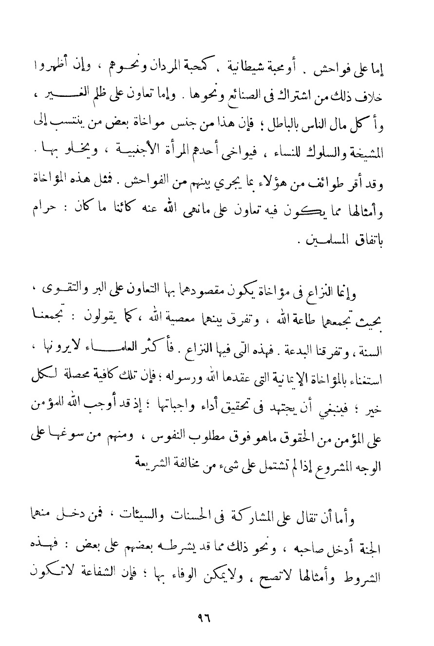 إمَّا عَلَى فَوَاحِشَ، أَوْ مَحَبَّةٍ شَيْطَانِيَّةٍ، كَمَحَبَّةِ المردان وَنَحْوِهِمْ، وَإِنْ أَظْهَرُوا خِلَافَ ذَلِكَ مِنْ اشْتِرَاكٍ فِي الصَّنَائِعِ وَنَحْوِهَا. وَإِمَّا تَعَاوُنٌ عَلَى ظُلْمِ الْغَيْرِ، وَأَكْلِ مَالِ النَّاسِ بِالْبَاطِلِ؛ فَإِنَّ هَذَا مِنْ جِنْسِ مُؤَاخَاةِ بَعْضِ مَنْ يَنْتَسِبُ إلَى الْمَشْيَخَةِ وَالسُّلُوكِ لِلنِّسَاءِ، فَيُوَاخِي أَحَدُهُمْ الْمَرْأَةَ الْأَجْنَبِيَّةَ، وَيَخْلُو بِهَا. وَقَدْ أَقَرَّ طَوَائِفُ مِنْ هَؤُلَاءِ بِمَا يَجْرِي بَيْنَهُمْ مِنْ الْفَوَاحِشِ. فَمِثْلُ هَذِهِ الْمُؤَاخَاةِ وَأَمْثَالِهَا مِمَّا يَكُونُ فِيهِ تَعَاوُنٌ عَلَى مَا نَهَى اللَّهُ عَنْهُ كَائِنًا مَا كَانَ: حَرَامٌ بِاتِّفَاقِ الْمُسْلِمِينَ. وَإِنَّمَا النِّزَاعُ فِي مُؤَاخَاةٍ يَكُونُ مَقْصُودُهُمَا بِهَا التَّعَاوُنُ عَلَى الْبِرِّ وَالتَّقْوَى، بِحَيْثُ تَجْمَعُهُمَا طَاعَةُ اللَّهِ، وَتُفَرِّقُ بَيْنَهُمَا مَعْصِيَةُ اللَّهِ، كَمَا يَقُولُونَ: تَجْمَعُنَا السُّنَّةُ، وَتُفَرِّقُنَا الْبِدْعَةُ. فَهَذِهِ الَّتِي فِيهَا النِّزَاعُ. فَأَكْثَرُ الْعُلَمَاءِ لَا يَرَوْنَهَا، اسْتِغْنَاءً بِالْمُؤَاخَاةِ الْإِيمَانِيَّةِ الَّتِي عَقَدَهَا اللَّهُ وَرَسُولُهُ؛ فَإِنَّ تِلْكَ كَافِيَةٌ مُحَصِّلَةٌ لِكُلِّ خَيْرٍ؛ فَيَنْبَغِي أَنْ يَجْتَهِدَ فِي تَحْقِيقِ أَدَاءِ وَاجِبَاتِهَا؛ إذْ قَدْ أَوْجَبَ اللَّهُ لِلْمُؤْمِنِ عَلَى الْمُؤْمِنِ مِنْ الْحُقُوقِ مَا هُوَ فَوْقَ مَطْلُوبِ النَّفُوسِ. وَمِنْهُمْ مَنْ سَوَّغَهَا عَلَى الْوَجْهِ الْمَشْرُوعِ إذَا لَمْ تَشْتَمِلْ عَلَى شَيْءٍ مِنْ مُخَالَفَةِ الشَّرِيعَةِ وَإِمَّا أَنْ تُقَالَ عَلَى الْمُشَارَكَةِ فِي الْحَسَنَاتِ وَالسَّيِّئَاتِ، فَمَنْ دَخَلَ مِنْهُمَا الْجَنَّةَ أَدْخَلَ صَاحِبَهُ، وَنَحْوَ ذَلِكَ مِمَّا قَدْ يَشْرِطُهُ بَعْضُهُمْ عَلَى بَعْضٍ: فَهَذِهِ الشُّرُوطُ وَأَمْثَالُهَا لَا تَصِحُّ، وَلَا يُمْكِنُ الْوَفَاءُ بِهَا؛ فَإِنَّ الشَّفَاعَةَ لَا تَكُونُ
