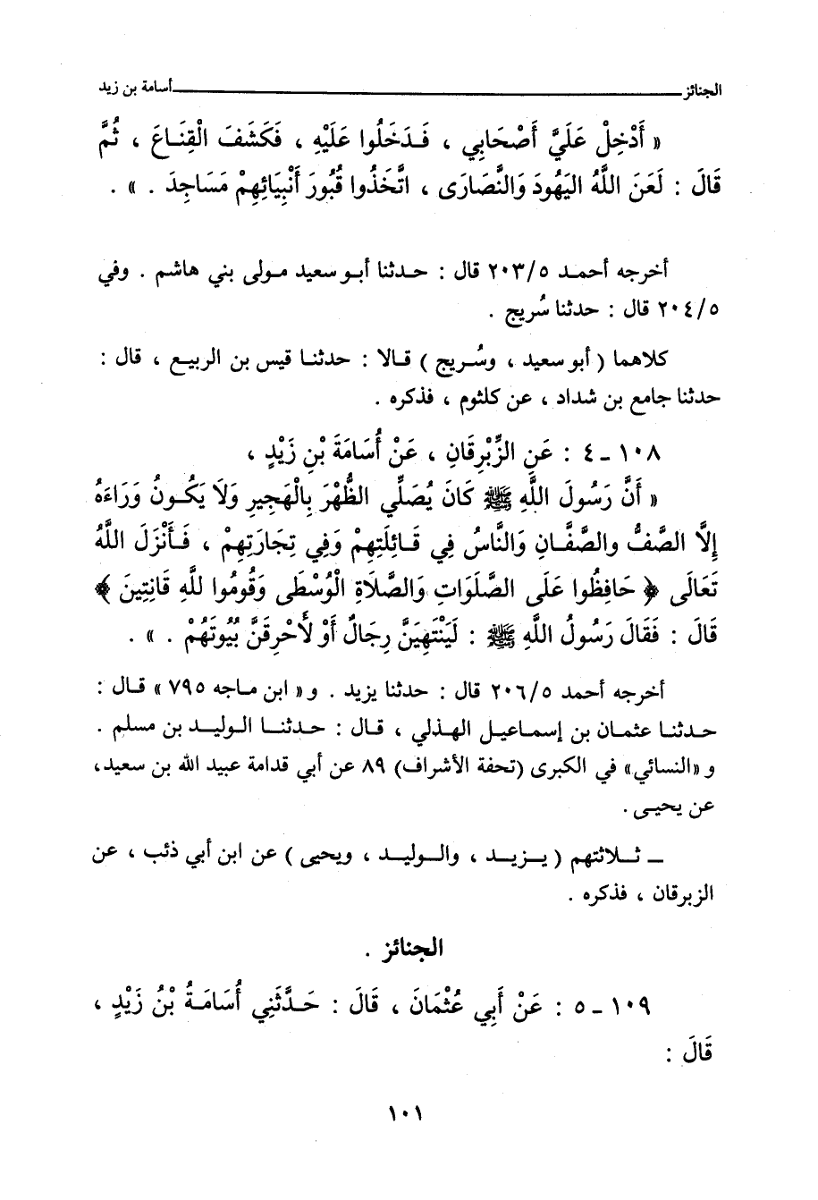أَدْخِلْ عَلَيَّ أَصْحَابِي، فَدَخَلُوا عَلَيْهِ، فَكَشَفَ الْقِنَاعَ، ثُمَّ قَالَ: لَعَنَ اللَّهُ الْيَهُودَ وَالنَّصَارَى، اتَّخَذُوا قُبُورَ أَنْبِيَائِهِمْ مَسَاجِدَ.