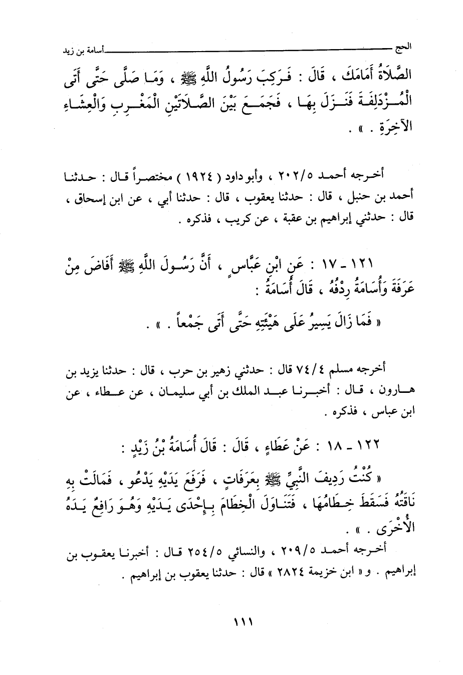 ١٢١ - عن عَطَاءٍ، عَنِ ابْنِ عَبَّاسٍ , أَنَّ رَسُولَ اللهِ صلى الله عليه وسلم أَفَاضَ مِنْ عَرَفَةَ، وَأُسَامَةُ رِدْفُهُ، قَالَ أُسَامَةُ: