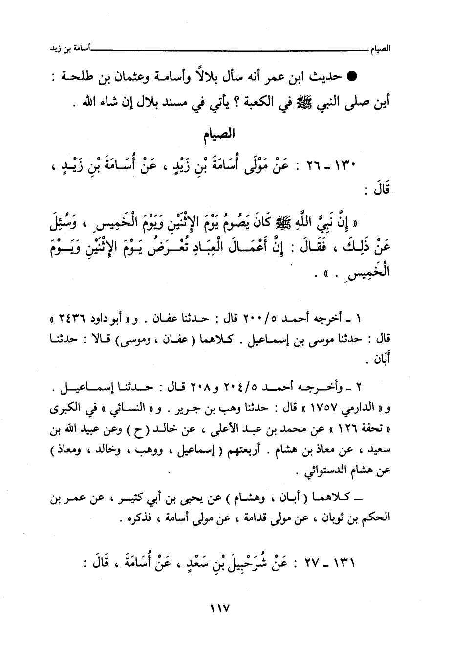 ١٣٠ - عَنْ مَوْلَى أُسَامَةَ بْنِ زَيْدٍ، أَنَّهُ انْطَلَقَ مَعَ أُسَامَةَ إِلَى وَادِي الْقُرَى، فِي طَلَبِ مَالٍ لَهُ، فَكَانَ يَصُومُ يَوْمَ الاِثْنَيْنِ، وَيَوْمَ الْخَمِيسِ، فَقَالَ لَهُ مَوْلَاهُ: لِمَ تَصُومُ يَوْمَ الاِثْنَيْنِ، وَيَوْمَ الْخَمِيسِ، وَأَنْتَ شَيْخٌ كَبِيرٌ؟ فَقَالَ: