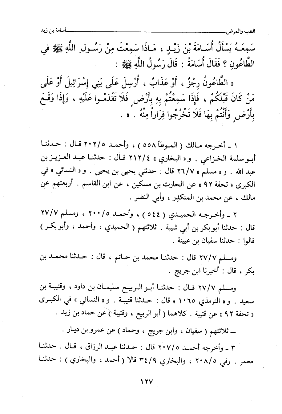 - وفي رواية: عَنْ عَامِرِ بْنِ سَعْدِ بْنِ أَبِي وَقَّاصٍ، عَنْ أُسَامَةَ بْنِ زَيْدٍ، قَالَ: قَالَ رَسُولُ اللَّهِ صلى الله عليه وسلم: إِذَا سَمِعْتُمْ بِالطَّاعُونِ بِأَرْضٍ، فَلَا تَدْخُلُوا عَلَيْهِ، وَإِذَا وَقَعَ وَأَنْتُمْ بِأَرْضٍ، فَلَا تَخْرُجُوا فِرَارًا مِنْهُ.