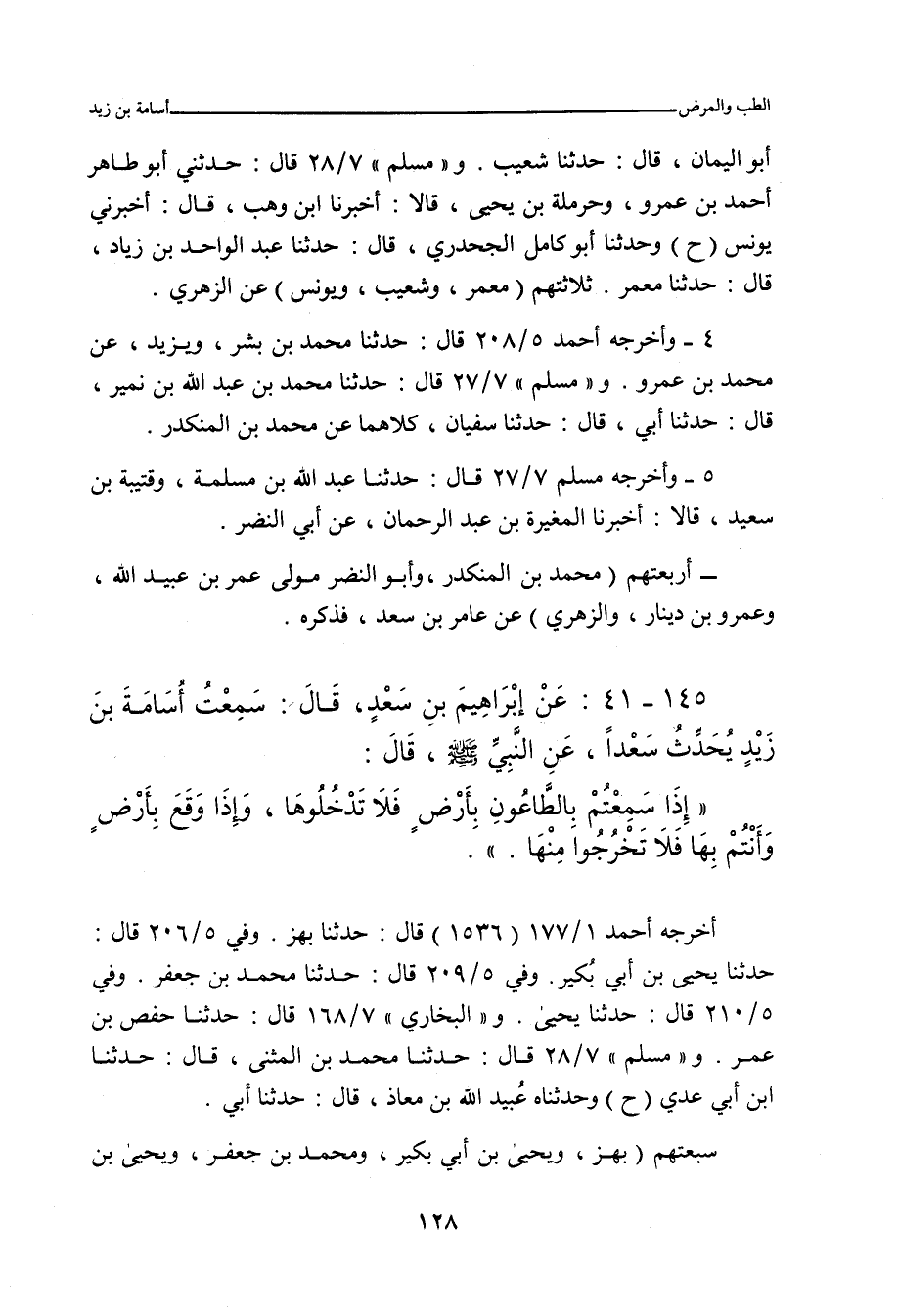 ١٤٥ - عَنْ حَبِيبِ بْنِ أَبِي ثَابِتٍ، قَالَ: قَدِمْتُ الْمَدِينَةَ، فَبَلَغَنَا أَنَّ الطَّاعُونَ وَقَعَ بِالْكُوفَةِ، قَالَ: فَقُلْتُ: مَنْ يَرْوِي هَذَا الْحَدِيثَ؟ فَقِيلَ: عَامِرُ بْنُ سَعْدٍ، قَالَ: وَكَانَ غَائِبًا، فَلَقِيتُ إِبْرَاهِيمَ بْنَ سَعْدٍ، فَحَدَّثَنِي أَنَّهُ سَمِعَ أُسَامَةَ بْنَ زَيْدٍ يُحَدِّثُ سَعْدًا، أَنَّ رَسُولَ اللَّهِ صلى الله عليه وسلم قَالَ: إِذَا وَقَعَ الطَّاعُونُ بِأَرْضِ فَلَا تَدْخُلُوهَا، وَإِذَا وَقَعَ وَأَنْتُمْ بِهَا، فَلَا تَخْرُجُوا مِنْهَا.