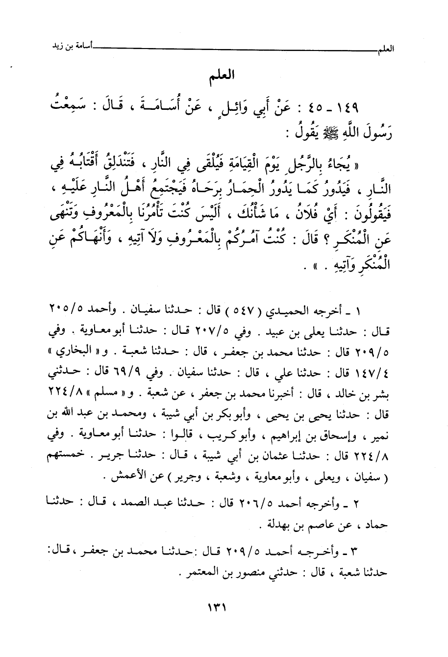 - وفي رواية: عَنْ أَبِي وَائِلٍ، قَالَ: قِيلَ لأُسَامَةَ بْنِ زَيْدٍ! قَالَ: سَمِعْتُ رَسُولَ اللَّهِ صلى الله عليه وسلم يَقُولُ: يُؤْتَى بِالرَّجُلِ الَّذِي كَانَ يُطَاعُ فِي مَعَاصِي اللَّهِ تَعَالَى، فَيُقْذَفُ فِي النَّارِ، فَتَنْدَلِقُ بِهِ أَقْتَابُهُ، فَيَسْتَدِيرُ فِيهَا كَمَا يَسْتَدِيرُ الْحِمَارُ فِي الرَّحَى، فَيَأْتِي عَلَيْهِ أَهْلُ طَاعَتِهِ مِنَ النَّاسِ، فَيَقُولُونَ: أَيْ فُلُ، أَيْنَ مَا كُنْتَ تَأْمُرُنَا بِهِ؟ فَيَقُولُ: إِنِّي كُنْتُ آمُرُكُمْ بِأَمْرٍ، وَأُخَالِفُكُمْ إِلَى غَيْرِهِ.
