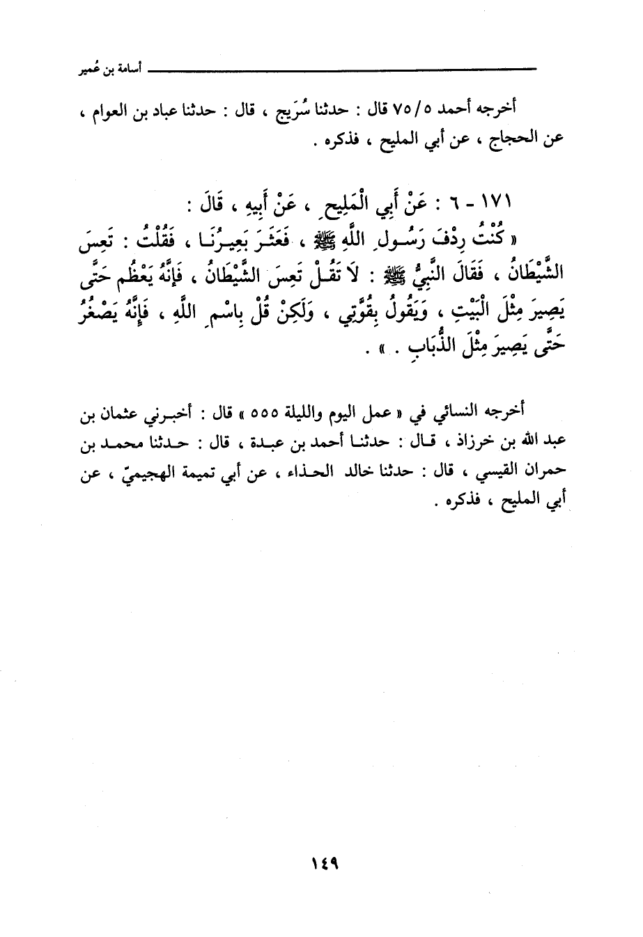 - وفي رواية: عَنْ أَبِي الْمَلِيحِ، عَنْ رِدْفِ رَسُولِ اللهِ صلى الله عليه وسلم، أَنَّ رَسُولَ اللهِ صلى الله عليه وسلم قَالَ إِذَا عَثَرَتْ بِكَ الدَّابَّةُ، فَلَا تَقُلْ: تَعِسَ الشَّيْطَانُ، فَإِنَّهُ يَتَعَاظَمُ، حَتَّى يَصِيرَ مِثْلَ الْبَيْتِ، وَيَقُولُ: بِقُوَّتِي صَنَعْتُهُ، وَلَكِنْ قُلْ: بِاسْمِ اللهِ، فَإِنَّهُ يَتَصَاغَرُ، حَتَّى يَصِيرَ مِثْلَ الذُّبَابِ.