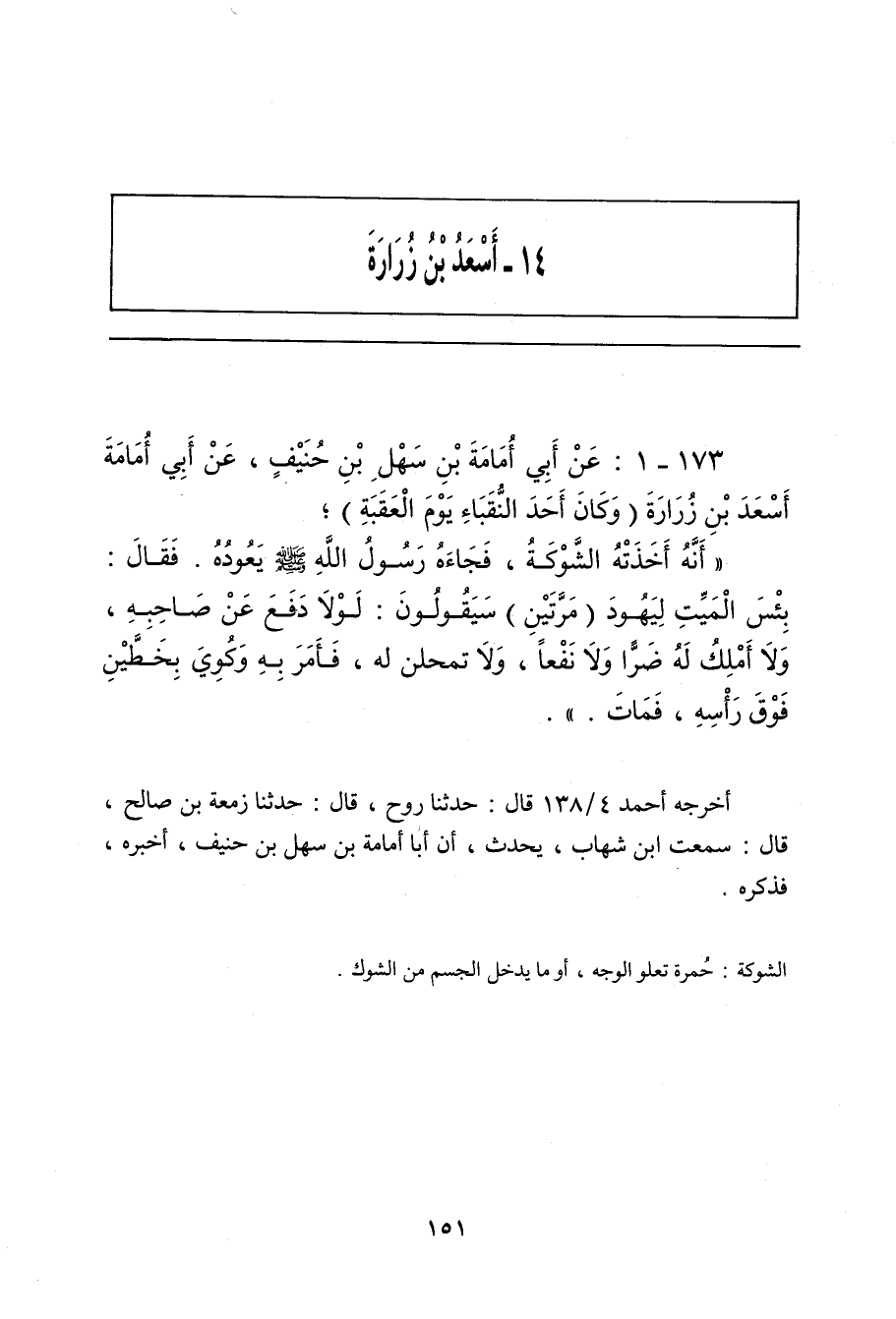 ١٧٣ - عَنْ أَبِي أُمَامَةَ بْنِ سَهْلِ بْنِ حُنَيْفٍ، عَنْ أَبِي أُمَامَةَ، أَسْعَدَ بْنِ زُرَارَةَ - وَكَانَ أَحَدَ النُّقَبَاءِ يَوْمَ الْعَقَبَةِ -؛