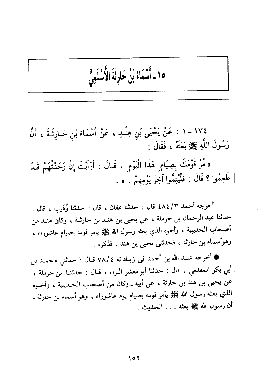 - أخرجه عَبْد الله بن أحمد، في زياداته ٤/ ٧٨ (١٦٨٣٦) قال: حدَّثني مُحَمد بن أَبي بَكْر المُقَدَّمِي، قال: حدَّثنا أبو مَعْشَر البَرَّاء، قال: حدَّثنا ابن حَرْمَلَة، عن يَحيى بن هِنْد بن حارثة، عَنْ أَبِيهِ، وَكَانَ مِنْ أَصْحَابِ الْحُدَيْبِيَةِ، وَأَخُوهُ الَّذِي بَعَثَهُ رَسُولُ اللهِ صلى الله عليه وسلم يَأْمُرُ قَوْمَهُ بِصِيَامِ يَوْمِ عَاشُورَاءَ، وَهُوَ أَسْمَاءُ بْنُ حَارِثَةَ؛