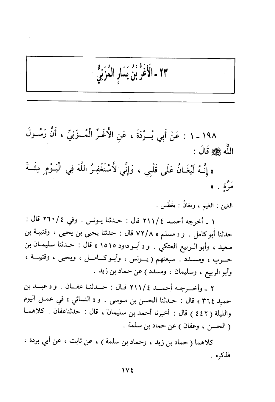 - وفي رواية: عَنِ الأَغَرِّ، أَغَرِّ مُزَيْنَةَ، قَالَ: سَمِعْتُ رَسُولَ اللَّهِ صلى الله عليه وسلم يَقُولُ: إِنَّهُ لَيُغَانُ عَلَى قَلْبِي، حَتَّى أَسْتَغْفِرَ اللَّهَ مِئَةَ مَرَّةٍ.