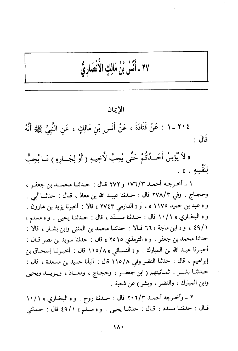 أخرجه أحمد ٣/ ١٧٦ (١٢٨٣٢) و ٣/ ٢٧٢ (١٣٩١٠) قال: حدَّثنا مُحَمد بن جَعْفَر، حدَّثنا شُعْبة (ح) وحَجَّاج، قال: حدَّثني شُعْبة. وفي ٣/ ٢٠٦ (١٣١٧٨) قال: حدَّثنا رَوْح، حدَّثنا حُسَيْن المُعَلِّم. وفي ٣/ ٢٥١ (١٣٦٦٤) قال: حدَّثنا عَفَّان، حدَّثنا هَمَّام. وفي ٣/ ٢٨٩ (١٤١٢٨) قال: حدَّثنا بَهْز، حدَّثنا هَمَّام. و"عَبد بن حُميد" ١١٧٤ قال: أخبرنا يَزِيد، أخبرنا شُعْبة. و"الدارِمِي" ٢٧٤٠ قال: أخبرنا يَزِيد بن هارون، أخبرنا شُعْبة. و"البُخَاريّ" ١٣ قال: حدَّثنا مُسَدَّد، قال: حدَّثنا يَحيى، عن شُعْبة، وعن حُسَيْن المُعَلِّم. و"مسلم" ٧٩ قال: حدَّثنا مُحَمد بن المُثَنَّى، وابن بَشَّار، قالا: حدَّثنا مُحَمد بن جَعْفَر , حدَّثنا شُعْبة. وفي (٨٠) قال: وحدَّثني زُهَيْر