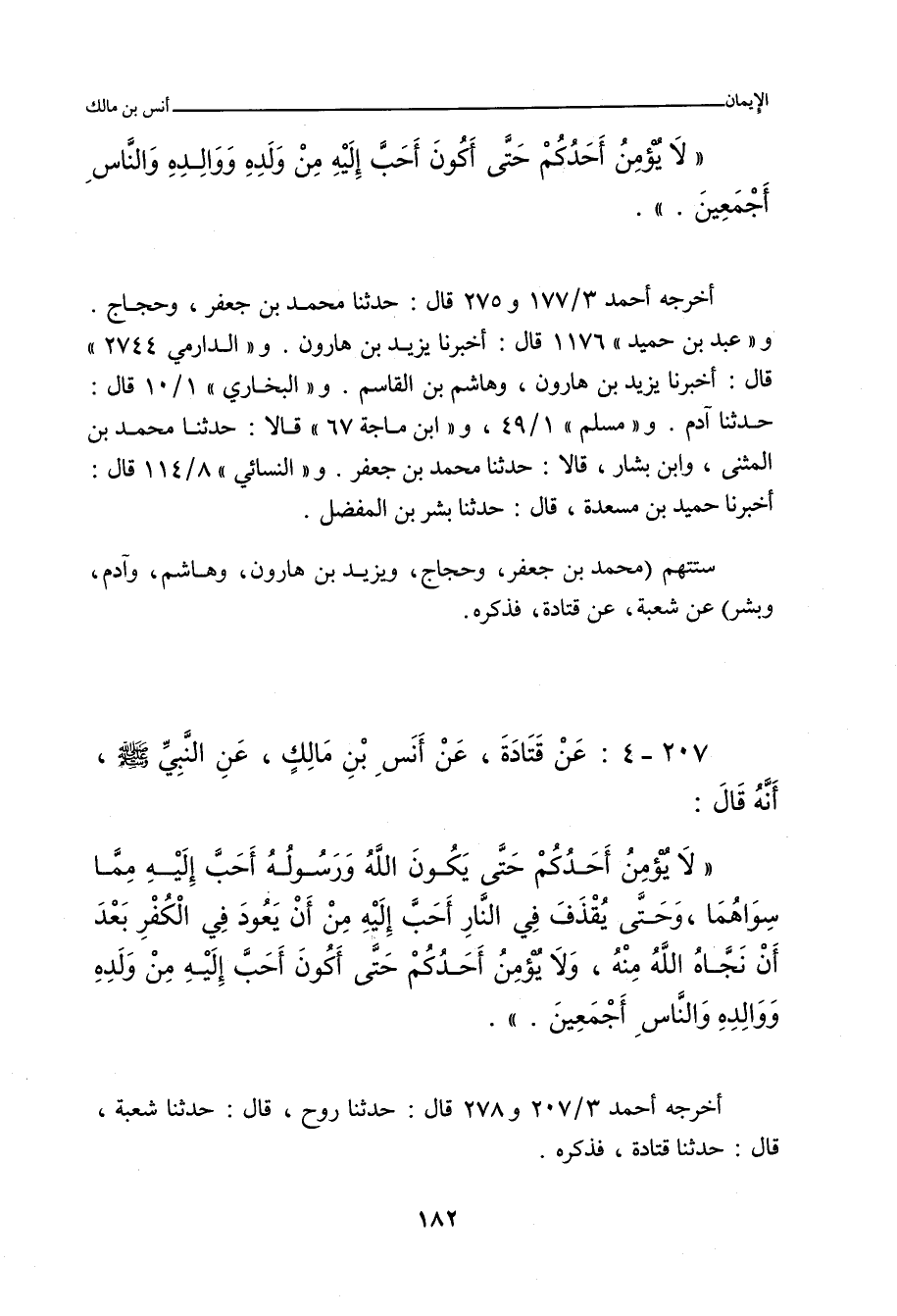 لَا يُؤْمِنُ أَحَدُكُمْ حَتَّى أَكُونَ أَحَبَّ إِلَيْهِ مِنْ وَلَدِهِ وَوَالِدِهِ، وَالنَّاسِ أَجْمَعِينَ.