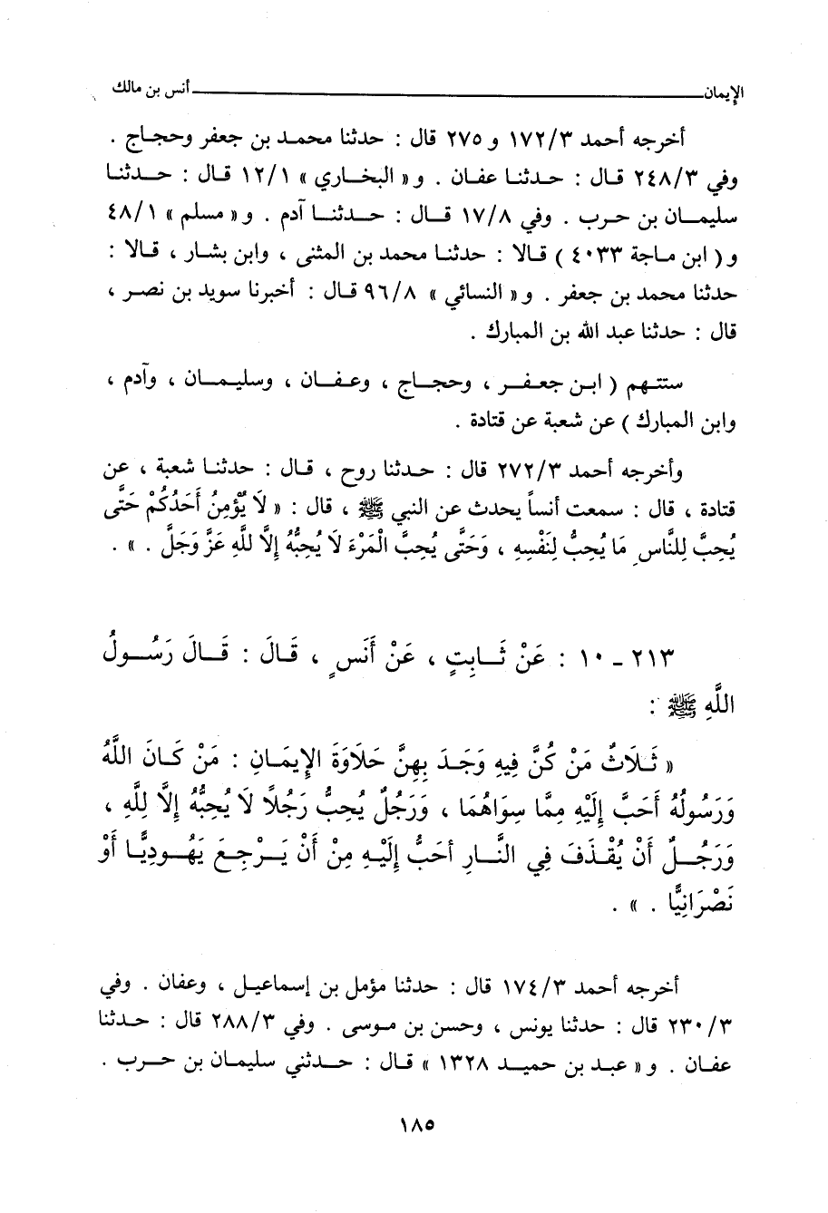 أخرجه أحمد ٣/ ١٧٢ (١٢٧٩٥) و ٣/ ٢٧٥ (١٣٩٥١) قال: حدَّثنا مُحَمد بن جَعْفَر (ح) وحَجَّاج. وفي ٣/ ٢٤٨ (١٣٦٢٧) قال: حدَّثنا عَفَّان. و"البُخَاريّ" ٢١ قال: حدَّثنا سُلَيْمان بن حَرْب. وفي (٦٠٤١) قال: حدَّثنا آدم. و"مسلم" ٧٥ قال: حدَّثنا مُحَمد بن المُثَنَّى، وابن بَشَّار، قالا: حدَّثنا مُحَمد بن جَعْفَر. و"ابن ماجة" ٤٠٣٣ قال: حدَّثنا مُحَمد بن المُثَنَّى، ومُحَمد بن بَشَّار، قالا: حدَّثنا مُحَمد بن جَعْفَر. و"النَّسائي" ٨/ ٩٦ قال: أخبرنا سُوَيْد بن نَصْر، قال: حدَّثنا عَبْد الله.