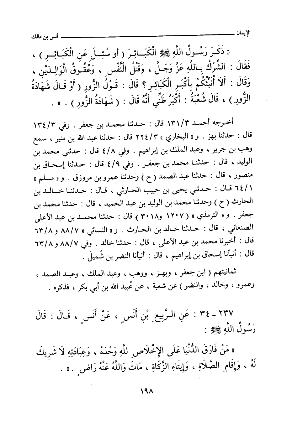 ذَكَرَ رَسُولُ اللهِ صلى الله عليه وسلم الْكَبَائِرَ، أَوْ سُئِلَ عَنِ الْكَبَائِرِ، فَقَالَ: الشِّرْكُ بِاللهِ، عَزَّ وَجَلَّ، وَقَتْلُ النَّفْسِ، وَعُقُوقُ الْوَالِدَيْنِ، وَقَالَ: أَلَا أُنَبِّئُكُمْ بِأَكْبَرِ الْكَبَائِرِ؟ قَالَ: قَوْلُ الزُّورِ، أَوْ قَالَ: شَهَادَةُ الزُّورِ.