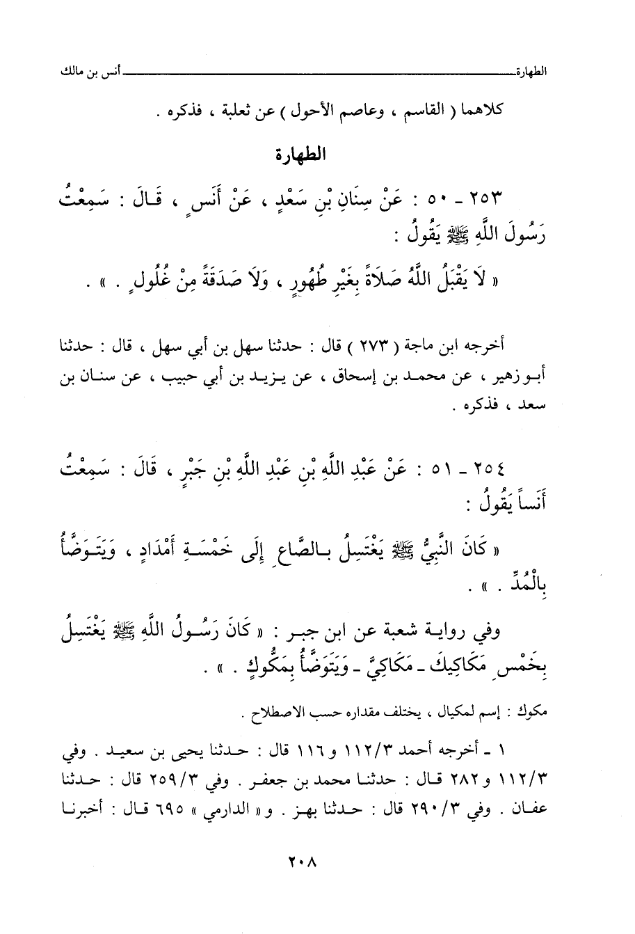 - وفي رواية: عَنْ سِنَانِ بْنِ سَعْدٍ، عَنْ أَنَسِ بْنِ مَالِكٍ، قَالَ: سَمِعْتُ رَسُولَ اللهِ صلى الله عليه وسلم يَقُولُ: لَا يَقْبَلُ اللَّهُ صَلَاةً بِغَيْرِ طُهُورٍ، وَلَا صَدَقَةً مِنْ غُلُولٍ.