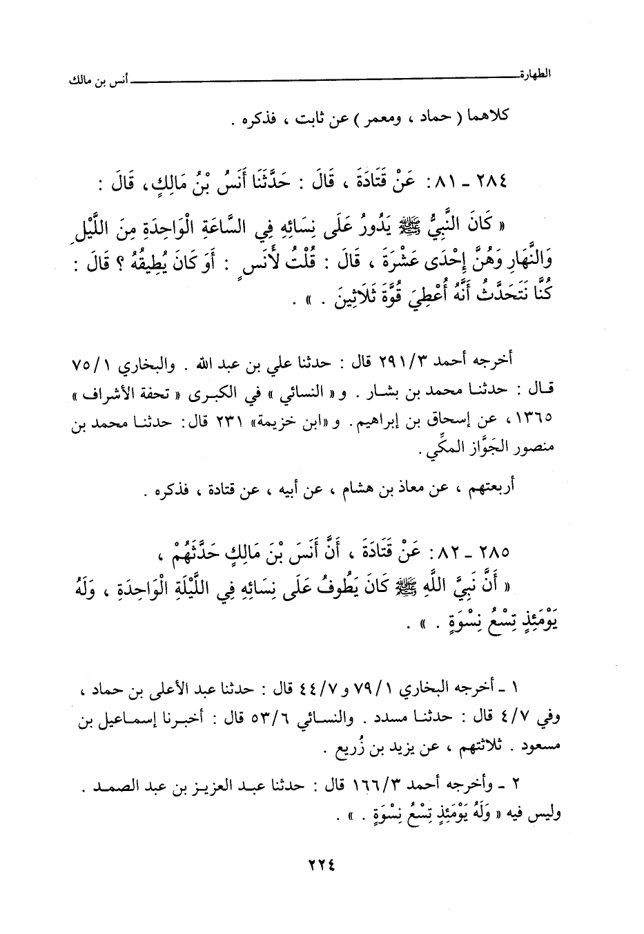 - وفي رواية: أَنَّ رَسُولَ اللهِ صلى الله عليه وسلم كَانَ يَدُورُ عَلَى نِسَائِهِ فِي السَّاعَةِ، مِنَ اللَّيْلِ وَالنَّهَارِ، وَهُنَّ إِحْدَى عَشْرَةَ.