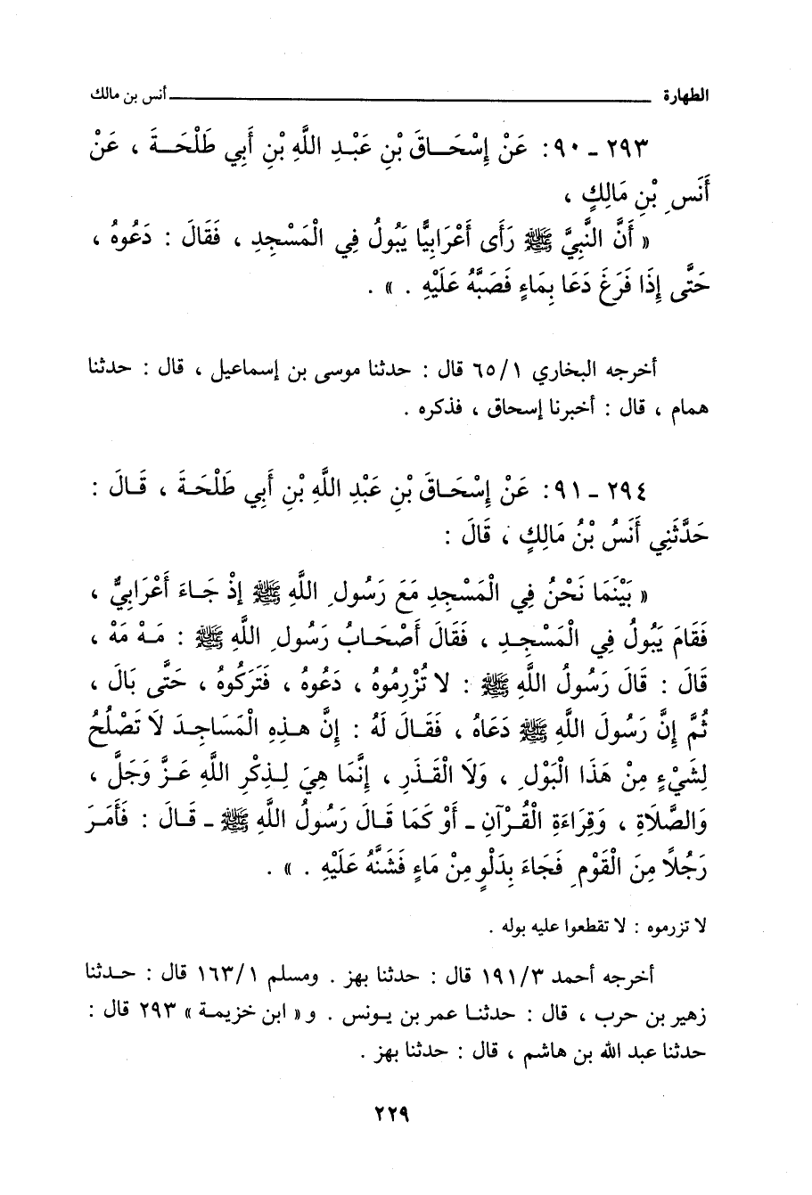 كَانَ رَسُولُ اللَّهِ صلى الله عليه وسلم جَالِسًا فِي الْمَسْجِدِ، وَأَصْحَابُهُ مَعَهُ، إِذْ جَاءَ أَعْرَابِيٌّ، فَبَالَ فِي الْمَسْجِدِ، فَقَالَ أَصْحَابُهُ: مَهْ، مَهْ، فَقَالَ رَسُولُ اللَّهِ صلى الله عليه وسلم: لَا تُزْرِمُوهُ، دَعُوهُ، ثُمَّ دَعَاهُ، فَقَالَ لَهُ: إِنَّ هَذِهِ الْمَسَاجِدَ لَا تَصْلُحُ لِشَيْءٍ مِنَ الْقَذَرِ وَالْبَوْلِ وَالْخَلَاءِ، أَوْ كَمَا قَالَ رَسُولُ اللَّهِ صلى الله عليه وسلم، إِنَّمَا هِيَ لِقِرَاءَةِ الْقُرْآنِ، وَذِكْرِ اللَّهِ، وَالصَّلَاةِ، فَقَالَ رَسُولُ اللَّهِ صلى الله عليه وسلم لِرَجُلٍ مِنَ الْقَوْمِ: قُمْ فَائْتِنَا بِدَلْوٍ مِنْ مَاءٍ، فَشُنَّهُ عَلَيْهِ، فَأَتَاهُ بِدَلْوٍ مِنْ مَاءٍ، فَشَنَّهُ عَلَيْهِ.