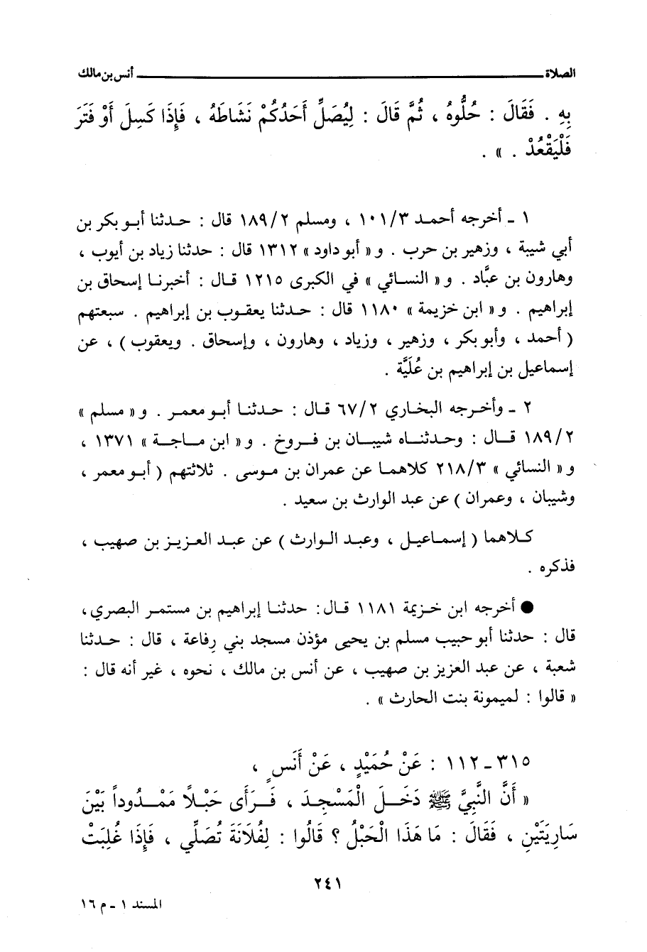 بِهِ، فَقَالَ: حُلُّوهُ، ثُمَّ قَالَ: لِيُصَلِّ أَحَدُكُمْ نَشَاطَهُ، فَإِذَا كَسِلَ، أَوْ فَتَرَ، فَلْيَقْعُدْ.