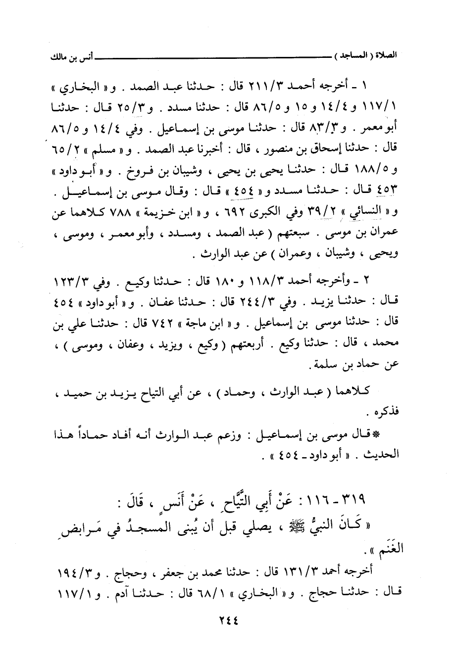 أخرجه أحمد ٣/ ١١٨ (١٢٢٠٢) و ٣/ ١٨٠ (١٢٨٨١) قال: حدَّثنا وَكِيع، حدَّثنا حَمَّاد بن سَلَمَة. وفي ٣/ ١٢٣ (١٢٢٦٧) قال: حدَّثنا يَزِيد، أنبانا حَمَّاد بن سَلَمَة. وفي ٣/ ٢١١ (١٣٢٤٠) قال: حدَّثنا عَبْد الصَّمَد، حدَّثني أَبي. وفي ٣/ ٢٤٤ (١٣٥٩٦) قال: حدَّثنا عَفَّان، حدَّثنا حَمَّاد بن سَلَمَة. و"البُخَاريّ" ١/ ١١٧ (٤٢٨) و ٤/ ١٤ (٢٧٧١) و ٤/ ١٥ (٢٧٧٩) و ٥/ ٨٦ (٣٩٣٢) قال: حدَّثنا مُسَدَّد، قال: حدَّثنا عَبْد الوارث. وفي ٣/ ٢٥ (١٨٦٨) قال: حدَّثنا أبو مَعْمَر، حدَّثنا عَبْد الوارث. وفي ٣/ ٨٣ (٢١٠٦) قال: حدَّثنا مُوسَى بن إِسْمَاعِيل، حدَّثنا عَبْد الوارث. وفي ٤/ ١٤ (٢٧٧٤) و ٥/ ٨٦ (٣٩٣٢) قال: حدَّثنا إِسْحَاق، حدَّثنا عَبْد الصَّمَد، قال: سَمِعْتُ أَبي. و"مسلم" ٢/ ٦٥ (١١٠٩) و ٥/ ١٨٨ (٤٦٩٩) قال: حدَّثنا يَحيى بن يَحيى، وشَيْبَان بن فَرُّوخ، كلاهما عن عَبْد الوارث، قال يَحيى: أخبرنا عَبْد الوارث بن سَعِيد. و"أبو داود" ٤٥٣ قال: حدَّثنا مُسَدَّد، حدَّثنا عَبْد الوارث. وفي (٤٥٤) قال: حدَّثنا مُوسَى بن إِسْمَاعِيل، حدَّثنا حَمَّاد بن سَلَمَة (ح) قال مُوسَى: وحدَّثنا عَبْد الوارث. و"ابن ماجة" ٧٤٢ قال: حدَّثنا علي بن مُحَمد، حدَّثنا وَكِيع، عن حَمَّاد بن سَلَمَة. و"النَّسائي" ٢/ ٣٩، وفي "الكبرى" ٧٨٣ قال: أخبرنا عِمْرَان بن مُوسَى، قال: حدَّثنا عَبْد الوارث. و"ابن خزيمة" ٧٨٨ قال: حدَّثنا عِمْرَان بن مُوسَى القَزَّاز، حدَّثنا عَبْد الوارث.