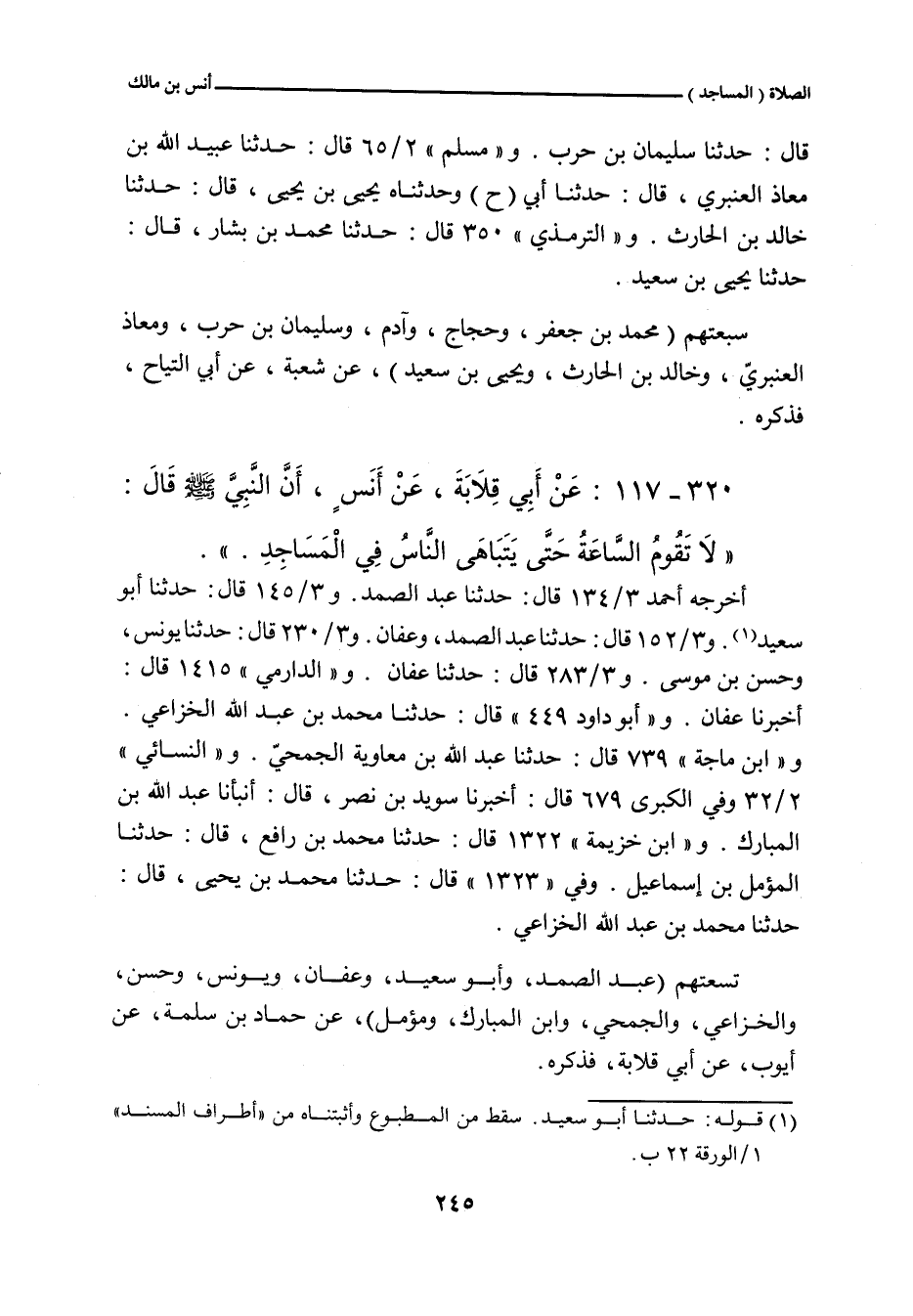 ٣٢٠ - عَنْ أَبِي قِلَابَةَ، عَنْ أَنَسٍ، أَنَّ رَسُولَ اللهِ صلى الله عليه وسلم قَالَ: