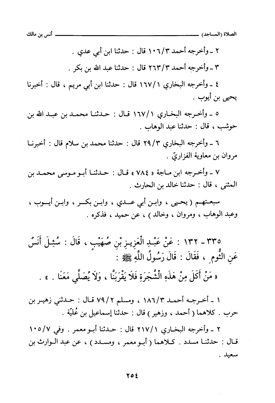 - وفي رواية: عَنْ عَبْدِ الْعَزِيزِ بْنِ صُهَيْبٍ، قَالَ: سُئِلَ أَنَسٌ عَنِ الثُّومِ؟ فَقَالَ: قَالَ رَسُولُ اللهِ صلى الله عليه وسلم: مَنْ أَكَلَ مِنْ هَذِهِ الشَّجَرَةِ فَلَا يَقْرَبَنَّا، وَلَا يُصَلِّي مَعَنَا.