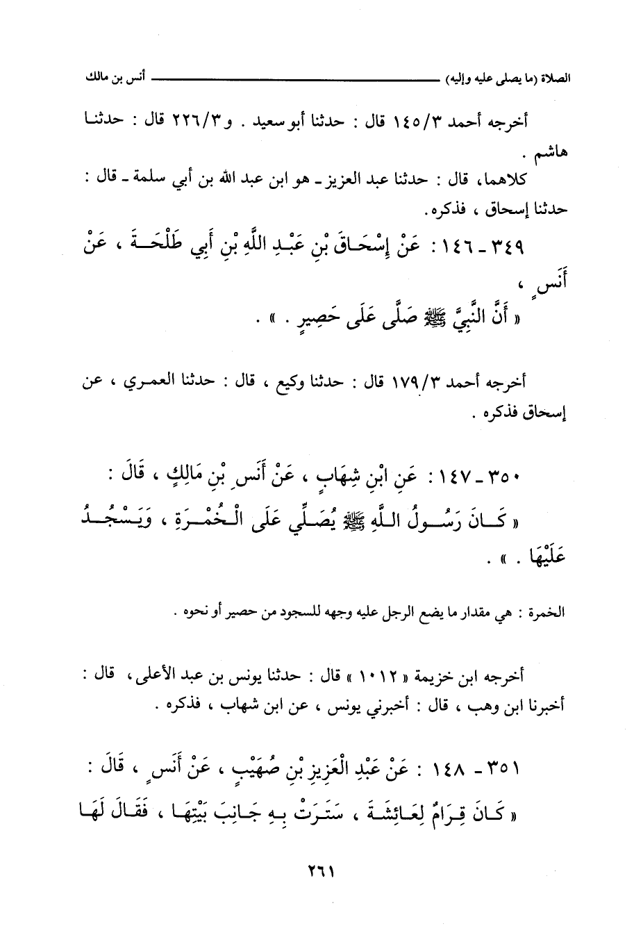٣٥٠ - عَنِ ابْنِ شِهَابٍ، قَالَ: لَمْ أَزَلْ أَسْمَعُ أَنَّ رَسُولَ اللهِ صلى الله عليه وسلم صَلَّى عَلَى خُمْرَةٍ، وَقَالَ عَنْ أَنَسِ بْنِ مَالِكٍ، قَالَ: