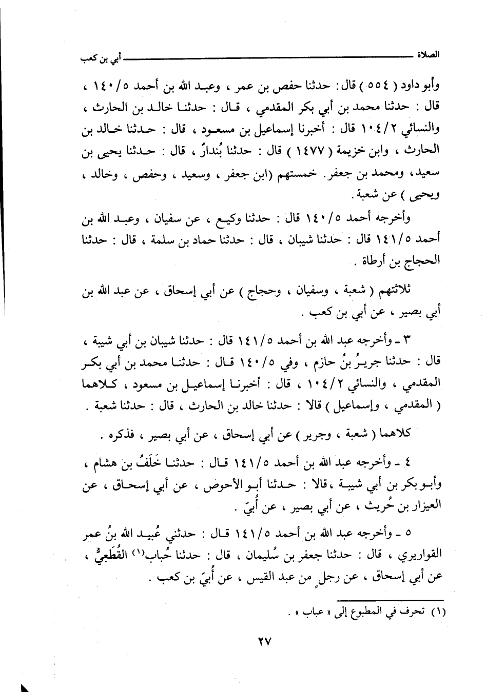 ثلاثتهم (شُعْبة، وسفيان الثوري، والحَجَّاج) عن أَبي إِسْحَاق، أَنَّهُ سَمِعَ عَبْدَ اللَّهِ بْنَ أَبِي بَصِيرٍ، يُحَدِّثُ عَنْ أُبَيِّ بْنِ كَعْبٍ، أَنَّهُ قَالَ: