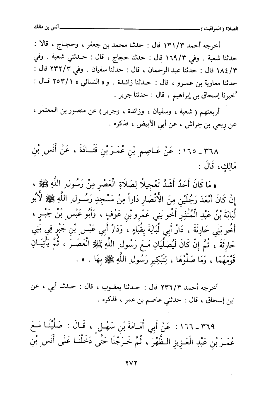 مَا كَانَ أَحَدٌ أَشَدَّ تَعْجِيلاً لِصَلَاةِ الْعَصْرِ مِنْ رَسُولِ اللهِ صلى الله عليه وسلم، إِنْ كَانَ أَبَعْدَ رَجُلَيْنِ مِنَ الأَنْصَارِ دَارًا مِنْ مَسْجِدِ رَسُولِ اللهِ صلى الله عليه وسلم، لأَبُو لُبَابَةَ بْنُ عَبْدِ الْمُنْذِرِ، أَخُو بَنِي عَمْرِو ابْنِ عَوْفٍ، وَأَبُو عَبْسِ بْنُ جَبْرٍ، أخو بَنِي حَارِثَةَ، دَارُ أَبِي لُبَابَةَ بِقُبَاءٍَ، وَدَارُ أَبِي عَبْسِ بْنِ جَبْرٍ فِي بَنِي حَارِثَةَ، ثُمَّ إِنْ كَانَا لَيُصَلِّيَانِ مَعَ رَسُولِ اللهِ صلى الله عليه وسلم الْعَصْرَ، ثُمَّ يَأْتِيَانِ قَوْمَهُمَا وَمَا صَلَّوْهَا، لِتَبْكِيرِ رَسُولِ اللهِ صلى الله عليه وسلم بِهَا.