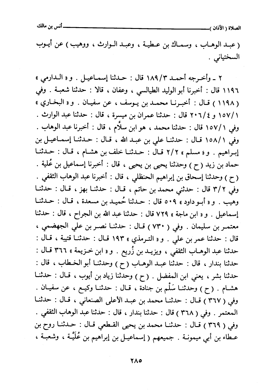 حدَّثنا وُهَيْب، جميعًا عن أَيُّوب. وفي (٥٠٩) قال: حدَّثنا حُمَيْد بن مَسْعَدَة، حدَّثنا إِسْمَاعِيل، عن خالد الحَذَّاء. و"ابن ماجة" ٧٢٩ قال: حدَّثنا عَبْد الله بن الجَرَّاح، حدَّثنا المُعْتَمِر بن سُلَيْمان، عن خالد الحَذَّاء. وفي (٧٣٠) قال: حدَّثنا نَصْر بن علي الجَهْضَمِي، حدَّثنا عُمَر بن علي، عن خالد الحَذَّاء. والتِّرْمِذِيّ" ١٩٣ قال: حدَّثنا قُتَيْبَة، حدَّثنا عَبْد الوَهَّاب الثَّقَفِي، ويَزِيد بن زُرَيْع، عن خالد الحَذَّاء. و"النَّسائي" ٢/ ٣، وفي "الكبرى" ١٦٠٤ قال: أخبرنا قُتَيْبَة بن سَعِيد، قال: حدَّثنا عَبْد الوَهَّاب، عن أَيُّوب. و"ابن خزيمة" ٣٦٦ قال: حدَّثنا بِشْر بن هِلَال، حدَّثنا عَبْد الوارث، يَعْنِي ابن سَعِيد، عن أَيُّوب (ح) وحدَّثنا بُنْدَار، حدَّثنا عَبْد الوَهَّاب، حدَّثنا أَيُّوب (ح) وحدَّثنا بُنْدَار، حدَّثنا عَبْد الوَهَّاب، حدَّثنا خالد (ح) وحدَّثنا أبو الخَطَّاب، حدَّثنا بِشْر، يَعْنِي ابن المُفَضَّل، حدَّثنا خالد (ح) وحدَّثنا زِيَاد بن أَيُّوب، حدَّثنا هِشَام، عن خالد (ح) وحدَّثنا سَلْم بن جُنَادَة، حدَّثنا وَكِيع، عن سُفْيان، عن خالد الحَذَّاء. وفي (٣٦٧) قال: حدَّثنا مُحَمد بن عَبْد الأَعْلَى الصَّنْعَانِي، حدَّثنا المُعْتَمِر، قال: سَمِعْتُ خالدًا. وفي (٣٦٨) قال: حدَّثنا بُنْدَار، حدَّثنا عَبْد الوَهَّاب الثَّقَفِي، حدَّثنا خالد. وفي (٣٦٩) قال: حدَّثنا مُحَمد بن يَحيى القُطَعِي، حدَّثنا رَوْح بن عَطَاء بن أَبي مَيْمُونَة، حدَّثنا خالد الحَذَّاء. وفي (٣٧٦) قال: حدَّثنا مُحَمد بن مَعْمَر القَيْسِي، حدَّثنا سُلَيْمان بن حَرْب، حدَّثنا حَمَّاد بن زَيْد، حدَّثنا سِمَاك بن عَطِيَّة، عن أَيُّوب.