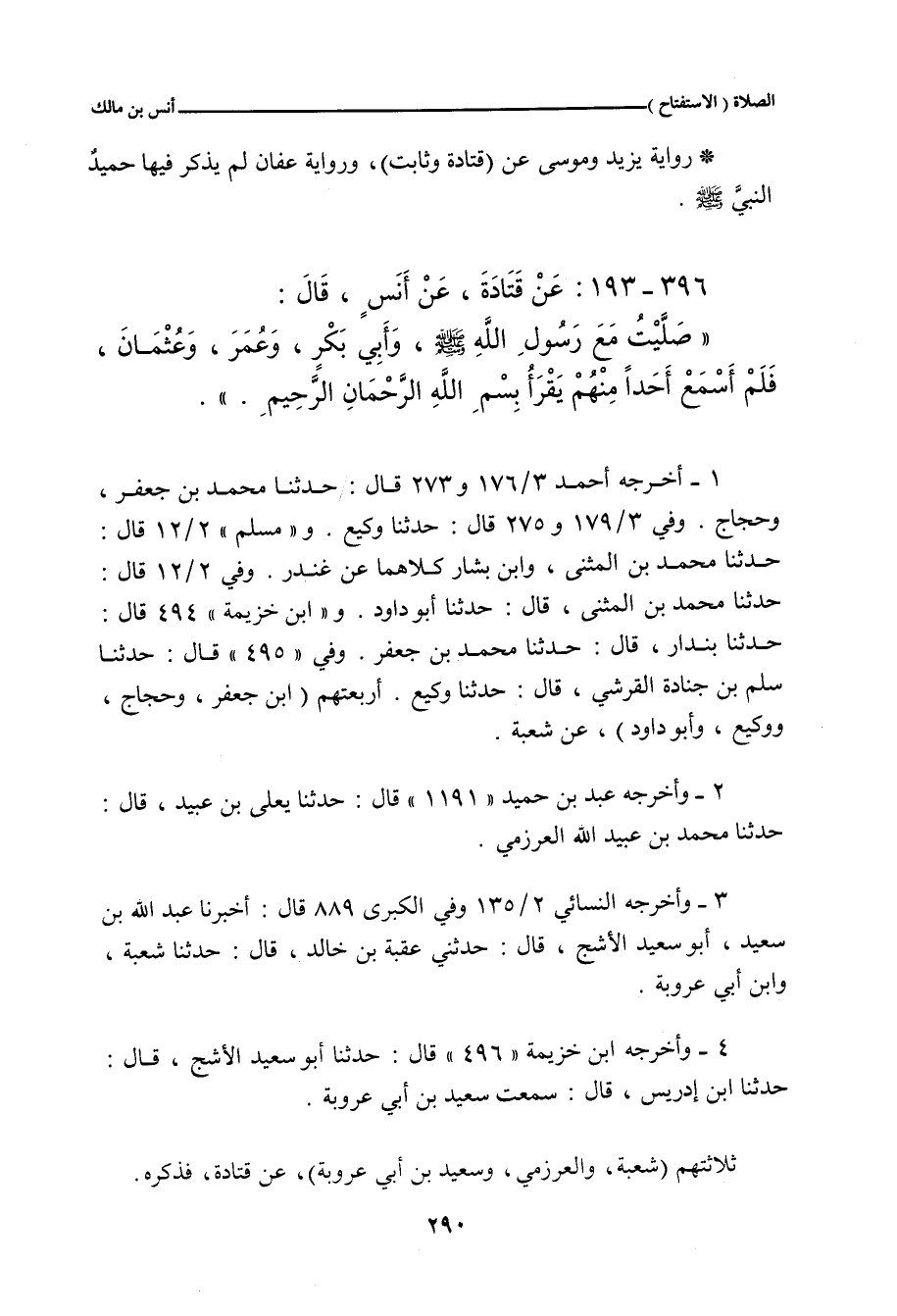 - وفي رواية: صَلَّيْتُ خَلْفَ رَسُولِ اللهِ صلى الله عليه وسلم، وَأَبِي بَكْرٍ، وَعُمَرَ، وَعُثْمَانَ، رَضِيَ اللَّهُ تَعَالَى عَنْهُمْ، فَلَمْ يَكُونُوا يَسْتَفْتِحُونَ الْقِرَاءَةَ بِـ: (بِسْمِ اللهِ الرَّحْمَانِ الرَّحِيمِ.