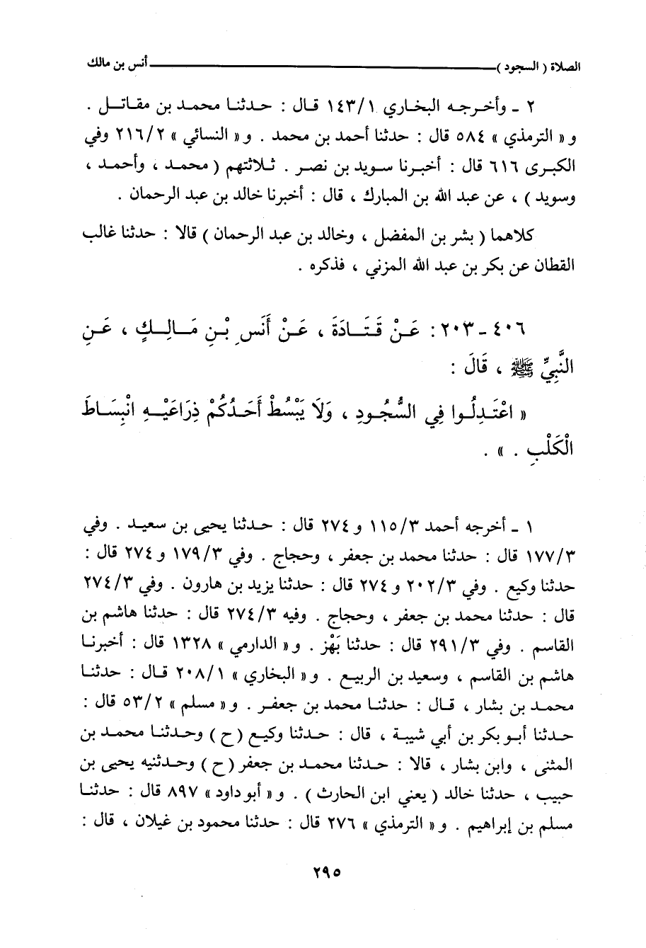 اعْتَدِلُوا فِي السُّجُودِ، وَلَا يَبْسُطْ أَحَدُكُمْ ذِرَاعَيْهِ انْبِسَاطَ الْكَلْبِ.