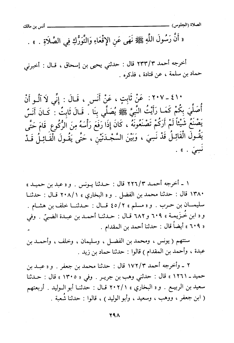 - وفي رواية: وَصَفَ لَنَا أَنَسُ بْنُ مَالِكٍ صَلَاةَ رَسُولِ اللهِ صلى الله عليه وسلم، ثُمَّ قَامَ يُصَلِّي بِنَا، فَرَكَعَ، فَاسْتَوَى قَائِمًا، حَتَّى رَأَى بَعْضُنَا أَنَّهُ قَدْ نَسِيَ، ثُمَّ سَجَدَ، فَاسْتَوَى قَاعِدًا، حَتَّى رَأَى بَعْضُنَا أَنَّهُ قَدْ نَسِيَ، ثُمَّ اسْتَوَى قَاعِدًا.