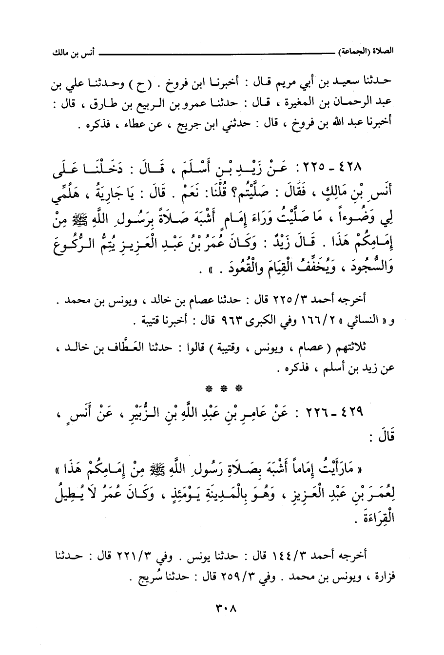 ٤٢٨ - عَنْ زَيْدِ بْنِ أَسْلَمَ، قَالَ: صَلَّيْنَا مَعَ عُمَرَ بْنِ عَبْدِ الْعَزِيزِ الظُّهْرَ، ثُمَّ انْصَرَفْنَا إِلَى أَنَسِ بْنِ مَالِكٍ نَسْأَلُ عَنْهُ، وَكَانَ شَاكِيًا، فَلَمَّا دَخَلْنَا عَلَيْهِ سَلَّمْنَا، قَالَ: أَصَلَّيْتُمْ؟ قُلْنَا: نَعَمْ، قَالَ: يَا جَارِيَةُ، هَلُمِّي لِي وَضُوءًا، مَا صَلَّيْتُ وَرَاءَ إِمَامٍ بَعْدَ رَسُولِ اللهِ صلى الله عليه وسلم أَشْبَهَ صَلَاةً بِرَسُولِ اللهِ صلى الله عليه وسلم مِنْ إِمَامِكُمْ هَذَا.