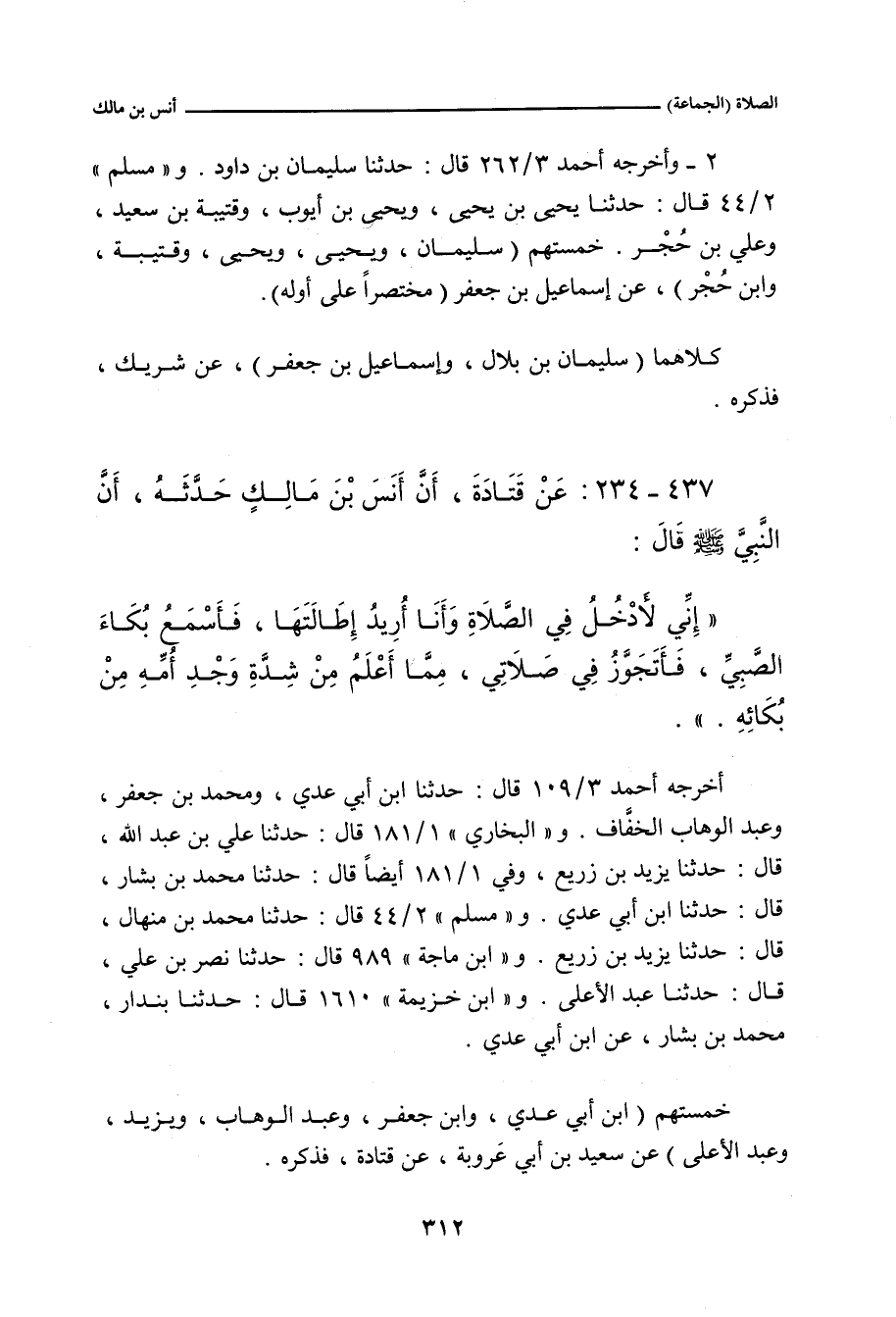 أخرجه أحمد ٣/ ١٠٩ (١٢٠٩٠) قال: حدَّثنا ابن أَبي عَدِي، وابن جَعْفَر، وعَبْد الوَهَّاب الخَفَّاف. و"البُخَاريّ" ٧٠٩ قال: حدَّثنا علي بن عَبْد الله، قال: حدَّثنا يَزِيد بن زُرَيْع، وفي (٧١٠) قال: حدَّثنا مُحَمد بن بَشَّار، قال: حدَّثنا ابن أَبي عَدِي. قال البُخَارِي: وقال مُوسَى: حدَّثنا أَبَان، حدَّثنا قَتَادَة، حدَّثنا أَنَس، عن النَّبِيِّ صلى الله عليه وسلم، مثله. و"مسلم" ٢/ ٤٤ (٩٨٩) قال: حدَّثنا مُحَمد بن مِنْهَال الضَّرِير، حدَّثنا يَزِيد بن زُرَيْع. و"ابن ماجة" ٩٨٩ قال: حدَّثنا نَصْر بن علي الجَهْضَمِي، حدَّثنا عَبْد الأَعْلَى. و"ابن خزيمة" ١٦١٠ قال: حدَّثنا بُنْدَار، مُحَمد بن بَشَّار، عن ابن أَبي عَدِي.