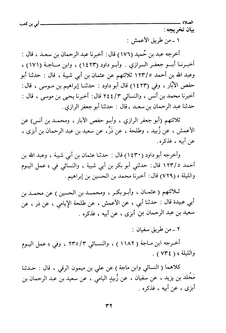 أخرجه عَبْد بن حُمَيْد ١٧٦ قال: أخبرنا عَبْد الرَّحْمان بن سَعْد، أخبرنا أبو جَعْفَر الرَّازِي، عن الأَعْمَش، عن زُبَيْد، وطَلْحَة، عن ذَرّ. و"أبو داود" ١٤٢٣ قال: حدَّثنا عُثْمَان بن أَبي شَيْبَة، حدَّثنا، أبو حَفْص الأَبَّار (ح) وحدَّثنا إبراهيم بن مُوسَى، أخبرنا مُحَمد بن أَنَس، عن الأَعْمَش، عن طَلْحَة، وزُبَيْد، عن ذَرّ. وفي (١٤٣٠) قال: حدَّثنا عُثْمَان بن أَبي شَيْبَة، حدَّثنا مُحَمد بن أَبي عُبَيْدَة، حدَّثنا أَبي، عن الأَعْمَش، عن طَلْحَة الإِيَامِي، عن ذَرّ. وفي (تحفة الأشراف) ١/ ٢٨ (٥٤) عن مُحَمد بن يَحيى بن فارس , عن إِسْحَاق بن إبراهيم، عن عِيسَى بن يُونُس، عن سَعِيد بن أَبي عَرُوبة، عن قَتَادَة. و"ابن ماجة" ١١٧١ قال: حدَّثنا عُثْمَان بن أَبي شَيْبَة، حدَّثنا أبو حَفْص الأَبَّار، حدَّثنا الأَعْمَش، عن طَلْحَة، وزُبَيْد، عن ذَرّ. وفي (١١٨٢) قال: حدَّثنا علي بن مَيْمُون الرَّقِّي، حدَّثنا مَخْلَد بن يَزِيد، عن سُفْيان، عن زُبَيْد اليَامِي. و (عَبْد الله ابن أحمد) ٥/ ١٢٣ (٢١٤٥٩) قال: حدَّثنا عُثْمَان بن أَبي شَيْبَة، حدَّثنا أبو حَفْص الأَبَّار، عن الأَعْمَش، عن طَلْحَة، وزُبَيْد، عن ذَرّ. وفي (٢١٤٦٠) قال: حدَّثنا أبو بَكْر بن أَبي شَيْبَة، حدَّثنا مُحَمد بن أَبي عُبَيْدَة، حدَّثنا أَبي، عن الأَعْمَش، عن طَلْحَة الإِيَامِي، عن ذَرّ. وفي (٢١٤٦١) قال: حدَّثنا مُحَمد بن عَبْد الرَّحِيم البَزَّاز، حدَّثنا أبو عُمَر الضَّرِير البَصْرِي، حدَّثنا جَرِير بن حازم، عن زُبَيْد، عن ذَرّ. و"النَّسائي" ٣/ ٢٣٥، وفي "الكبرى" ١٤٣٦, وفي "عمل اليوم والليلة" ٧٣٤ قال: أخبرنا علي بن مَيْمُون، قال: حدَّثنا مَخْلَد بن يَزِيد، عن سُفْيان، عن زُبَيْد.