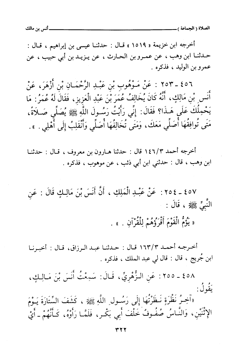 ٤٥٦ - عَنْ مَوْهُوبِ بْنِ عَبْدِ الرَّحْمَانِ بْنِ أَزْهَرَ، عَنْ أَنَسِ بْنِ مَالِكٍ، أَنَّهُ كَانَ يُخَالِفُ عُمَرَ بْنَ عَبْدِ الْعَزِيزِ، فَقَالَ لَهُ عُمَرُ: مَا يَحْمِلُكَ عَلَى هَذَا؟ فَقَالَ:
