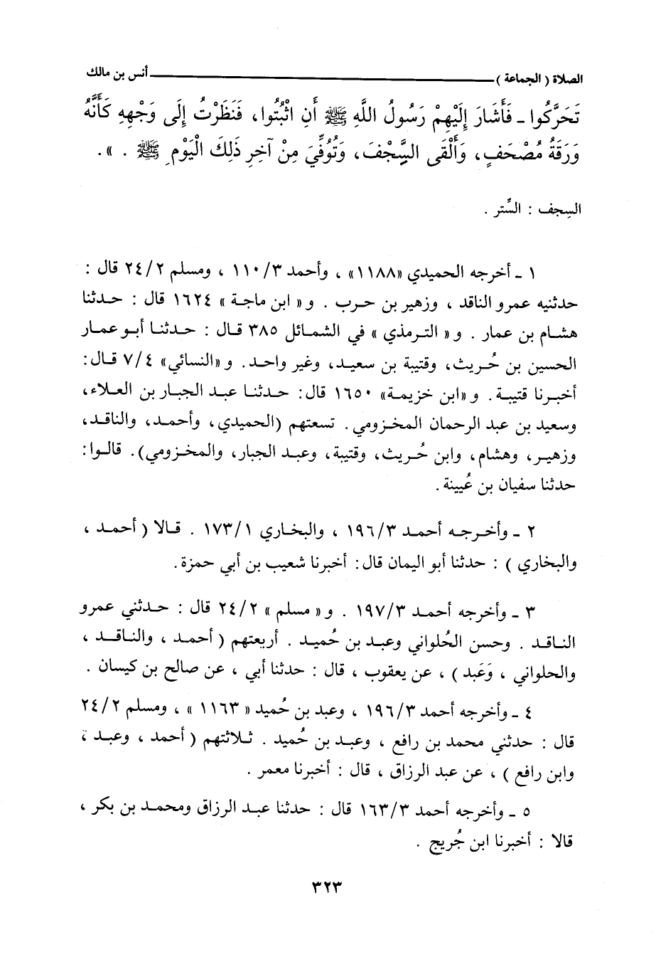 - وفي رواية: أَنَّ أَبَا بَكْرٍ كَانَ يُصَلِّي لَهُمْ فِي وَجَعِ النَّبِيِّ صلى الله عليه وسلم الَّذِي تُوُفِّيَ فِيهِ، حَتَّى إِذَا كَانَ يَوْمُ الاِثْنَيْنِ، وَهُمْ صُفُوفٌ فِي الصَّلَاةِ، فَكَشَفَ النَّبِيُّ صلى الله عليه وسلم سِتْرَ الْحُجْرَةِ يَنْظُرُ إِلَيْنَا، وَهْوَ قَائِمٌ، كَأَنَّ وَجْهَهُ وَرَقَةُ مُصْحَفٍ، ثُمَّ تَبَسَّمَ يَضْحَكُ، فَهَمَمْنَا أَنْ نَفْتَتِنَ مِنَ الْفَرَحِ بِرُؤْيَةِ النَّبِيِّ صلى الله عليه وسلم، فَنَكَصَ أَبُو بَكْرٍ عَلَى عَقِبَيْهِ لِيَصِلَ الصَّفَّ، وَظَنَّ أَنَّ النَّبِيَّ صلى الله عليه وسلم خَارِجٌ إِلَى الصَّلَاةِ، فَأَشَارَ إِلَيْنَا النَّبِيُّ صلى الله عليه وسلم أَنْ أَتِمُّوا صَلَاتَكُمْ، وَأَرْخَى السِّتْرَ، فَتُوُفِّيَ مِنْ يَوْمِهِ.