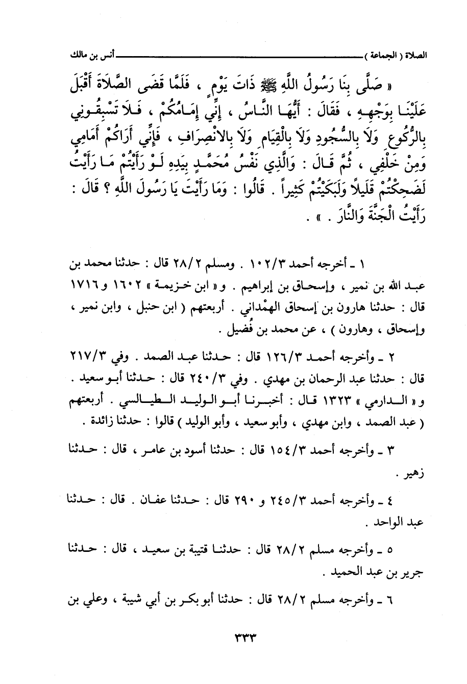 - وفي رواية: صَلَّى بِنَا رَسُولُ اللهِ صلى الله عليه وسلم ذَاتَ يَوْمٍ، فَلَمَّا قَضَى الصَّلَاةَ، أَقْبَلَ عَلَيْنَا بِوَجْهِهِ، فَقَالَ: أَيُّهَا النَّاسُ، إِنِّي إِمَامُكُمْ، فَلَا تَسْبِقُونِي بِالرُّكُوعِ، وَلَا بِالسُّجُودِ، وَلَا بِالْقِيَامِ، وَلَا بِالاِنْصِرَافِ، فَإِنِّي أَرَاكُمْ أَمَامِي، وَمِنْ خَلْفِي، ثُمَّ قَالَ: وَالَّذِي نَفْسُ مُحَمَّدٍ بِيَدِهِ، لَوْ رَأَيْتُمْ مَا رَأَيْتُ، لَضَحِكْتُمْ قَلِيلاً، وَلَبَكَيْتُمْ كَثِيرًا، قَالُوا: وَمَا رَأَيْتَ يَا رَسُولَ اللهِ؟ قَالَ: رَأَيْتُ الْجَنَّةَ وَالنَّارَ.