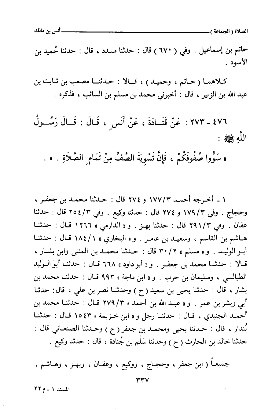 - وأخرجه أحمد ٣/ ٢٥٤ (١٣٦٩٩) قال: حدَّثنا عَفَّان، حدَّثنا شُعْبة، قال: أخبرني قَتَادَة، عن أَنَس بن مالك، قال: سووا صفوفكم، فإن تَسْوِيَةَ الصَّف من تمام الصَّلاة.