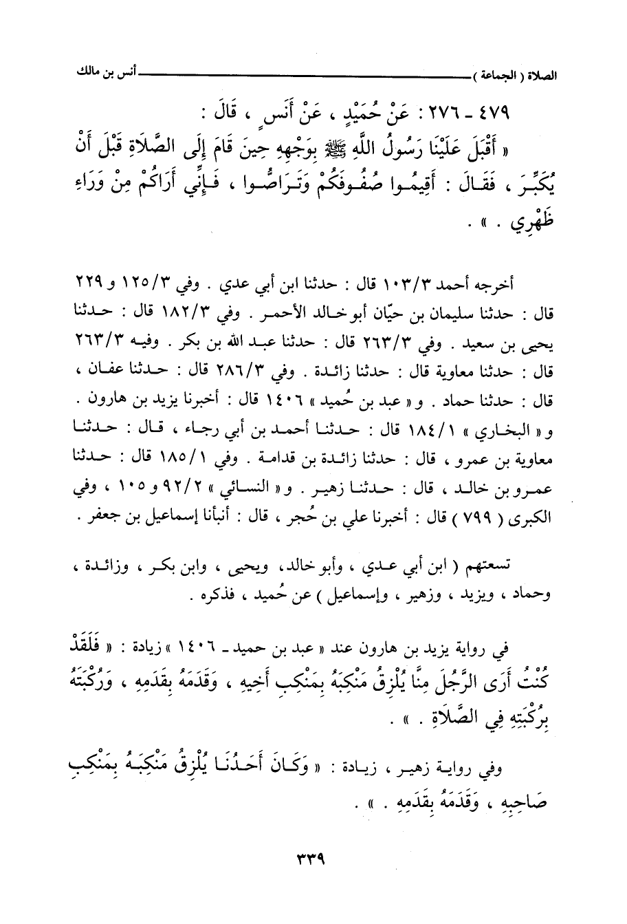 - وفي رواية: أَنَّ رَسُولَ اللهِ صلى الله عليه وسلم، بَعْدَ أَنْ أُقِيمَتِ الصَّلَاةُ، قَبْلَ أَنْ يُكَبِّرَ، أَقْبَلَ عَلَى الْقَوْمِ بِوَجْهِهِ، فَقَالَ: أَقِيمُوا صُفُوفَكُمْ وَتَرَاصُّوا، فَإِنِّى أَرَاكُمْ مِنْ وَرَاءِ ظَهْرِي، فَلَقَدْ كُنْتُ أَرَى الرَّجُلَ مِنَّا يَلْزِقُ مَنْكِبَهُ بِمَنْكِبِ أَخِيهِ، وَقَدَمَهُ بِقَدَمِهِ، وَرُكْبَتَهُ بِرُكْبَتِهِ، فِي الصَّلَاةِ.