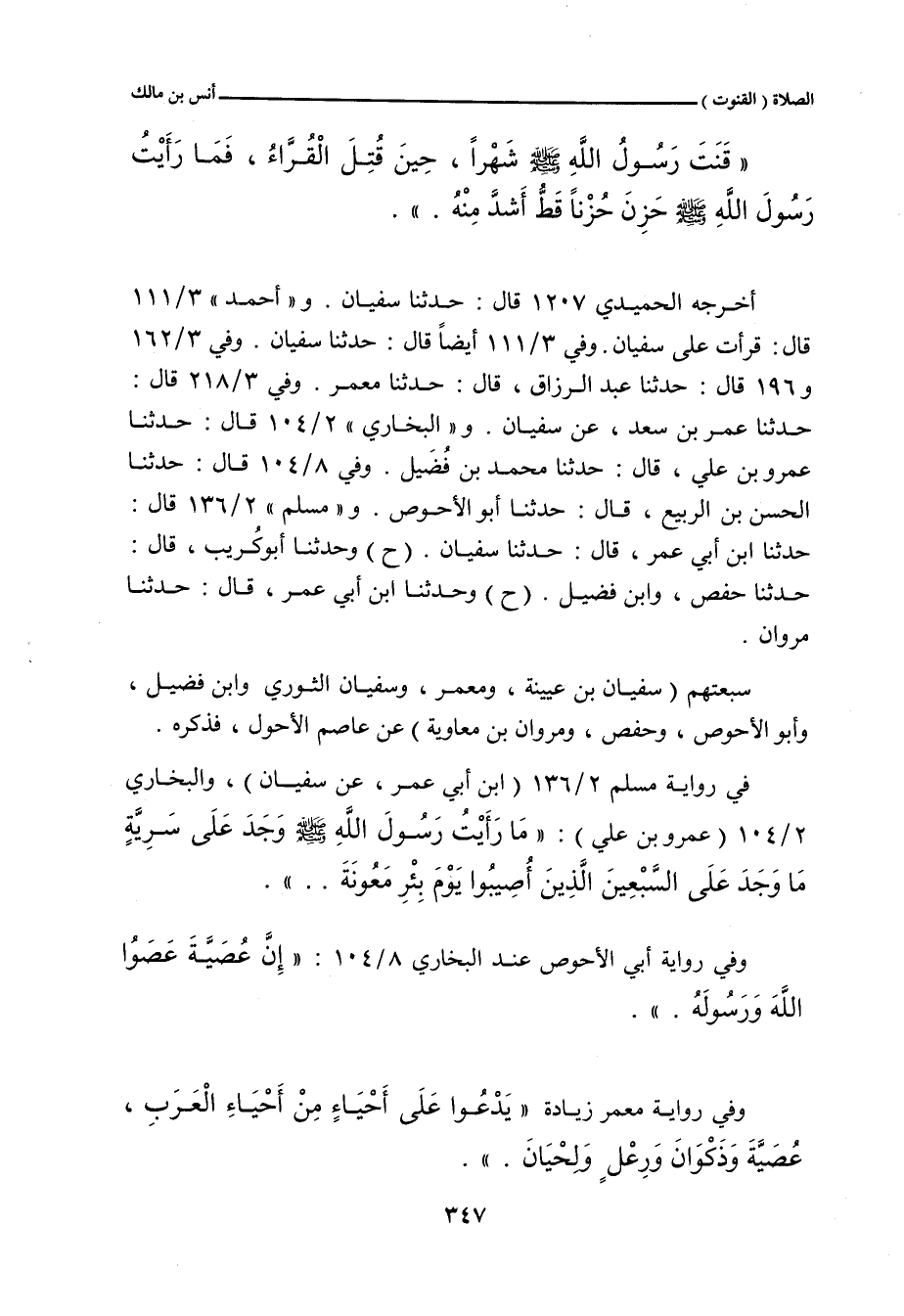 - وفي رواية: عَنْ عَاصِمٍ الأَحْوَلِ، قَالَ: سَأَلْتُ أَنَسًا عَنِ الْقُنُوتِ؟ قَالَ: قَبْلَ الرُّكُوعِ، فَقُلْتُ: إِنَّ فُلَانًا يَزْعُمُ أَنَّكَ قُلْتَ: بَعْدَ الرُّكُوعِ، فَقَالَ: كَذَبَ، ثُمَّ حَدَّثَنَا عَنِ النَّبِيِّ صلى الله عليه وسلم، أَنَّهُ قَنَتَ شَهْرًا بَعْدَ الرُّكُوعِ، يَدْعُو عَلَى أَحْيَاءٍ مِنْ بَنِي سُلَيْمٍ، قَالَ: بَعَثَ أَرْبَعِينَ، أَوْ سَبْعِينَ، يَشُكُّ فِيهِ، مِنَ الْقُرَّاءِ، إِلَى أُنَاسٍ مِنَ الْمُشْرِكِينَ، فَعَرَضَ لَهُمْ هَؤُلَاءِ فَقَتَلُوهُمْ، وَكَانَ بَيْنَهُمْ وَبَيْنَ النَّبِيِّ صلى الله عليه وسلم عَهْدٌ، فَمَا رَأَيْتُهُ وَجَدَ عَلَى أَحَدٍ مَا وَجَدَ عَلَيْهِمْ.