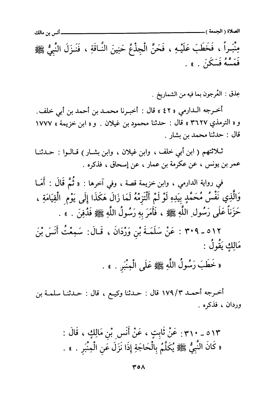 - وفي رواية: أَنَّ النَّبِيَّ صلى الله عليه وسلم كَانَ يَعْرِضُ لَهُ الرَّجُلُ يَوْمَ الْجُمُعَةِ، بَعْدَ مَا يَنْزِلُ عَنِ الْمِنْبَرِ، فَيُكَلِّمُهُ، ثُمَّ يَدْخُلُ فِي الصَّلَاةِ.