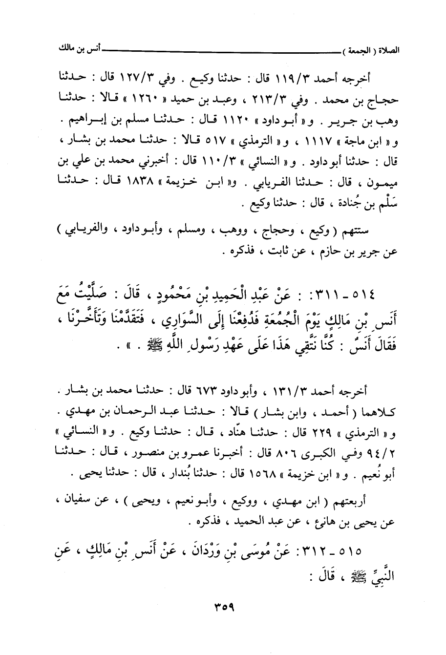 ٥١٤ - عَنْ عَبْدِ الْحَمِيدِ بْنِ مَحْمُودٍ، قَالَ: صَلَّيْتُ مَعَ أَنَسٍ يَوْمَ الْجُمُعَةِ، فَدُفِعْنَا إِلَى السَّوَارِي، فَتَقَدَّمْنَا أَوْ َتَأَخَّرْنَا، فَقَالَ أَنَسٌ: