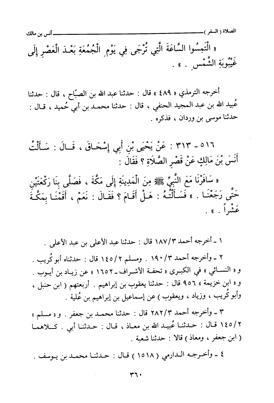 ٥١٦ - عَنْ يَحْيَى بْنِ أَبِي إِسْحَاقَ، قَالَ: سَأَلْتُ أَنَسَ بْنَ مَالِكٍ عَنْ قَصْرِ الصَّلَاةِ؟ فَقَالَ: