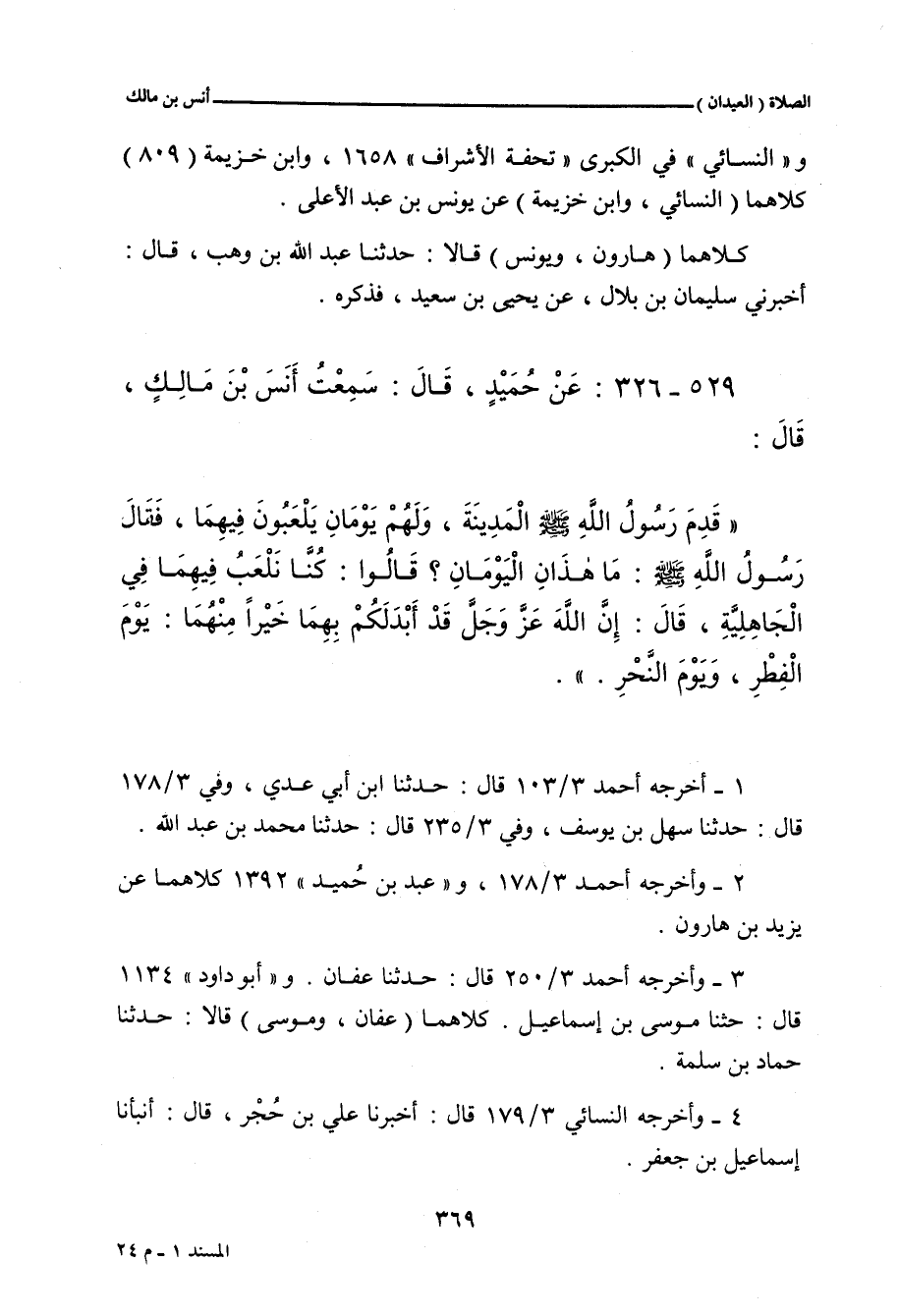 قَدِمَ رَسُولُ اللهِ صلى الله عليه وسلم الْمَدِينَةَ، وَلَهُمْ يَوْمَانِ يَلْعَبُونَ فِيهِمَا، فَقَالَ رَسُولُ اللهِ صلى الله عليه وسلم: مَا هَذَانِ الْيَوْمَانِ؟ قَالُوا: كُنَّا نَلْعَبُ فِيهِمَا فِي الْجَاهِلِيَّةِ، قَالَ: إِنَّ اللَّهَ، عَزَّ وَجَلَّ، قَدْ أَبْدَلَكُمْ بِهِمَا خَيْرًا مِنْهُمَا، يَوْمَ الْفِطْرِ، وَيَوْمَ النَّحْرِ.