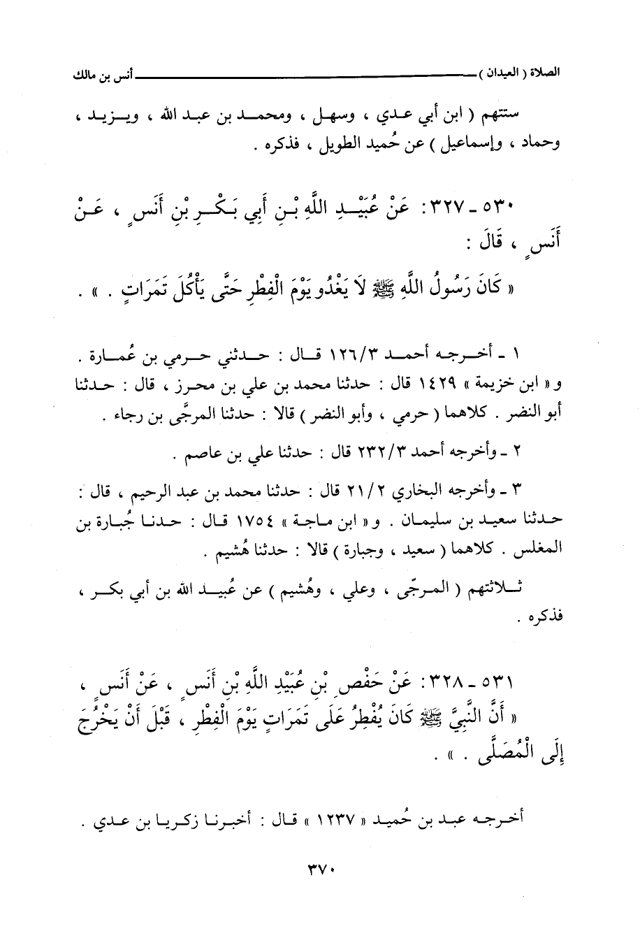 - وفي رواية: كَانَ رَسُولُ اللهِ صلى الله عليه وسلم يُفْطِرُ، يَوْمَ الْفِطْرِ، عَلَى تَمَرَاتٍ، ثُمَّ يَغْدُو.