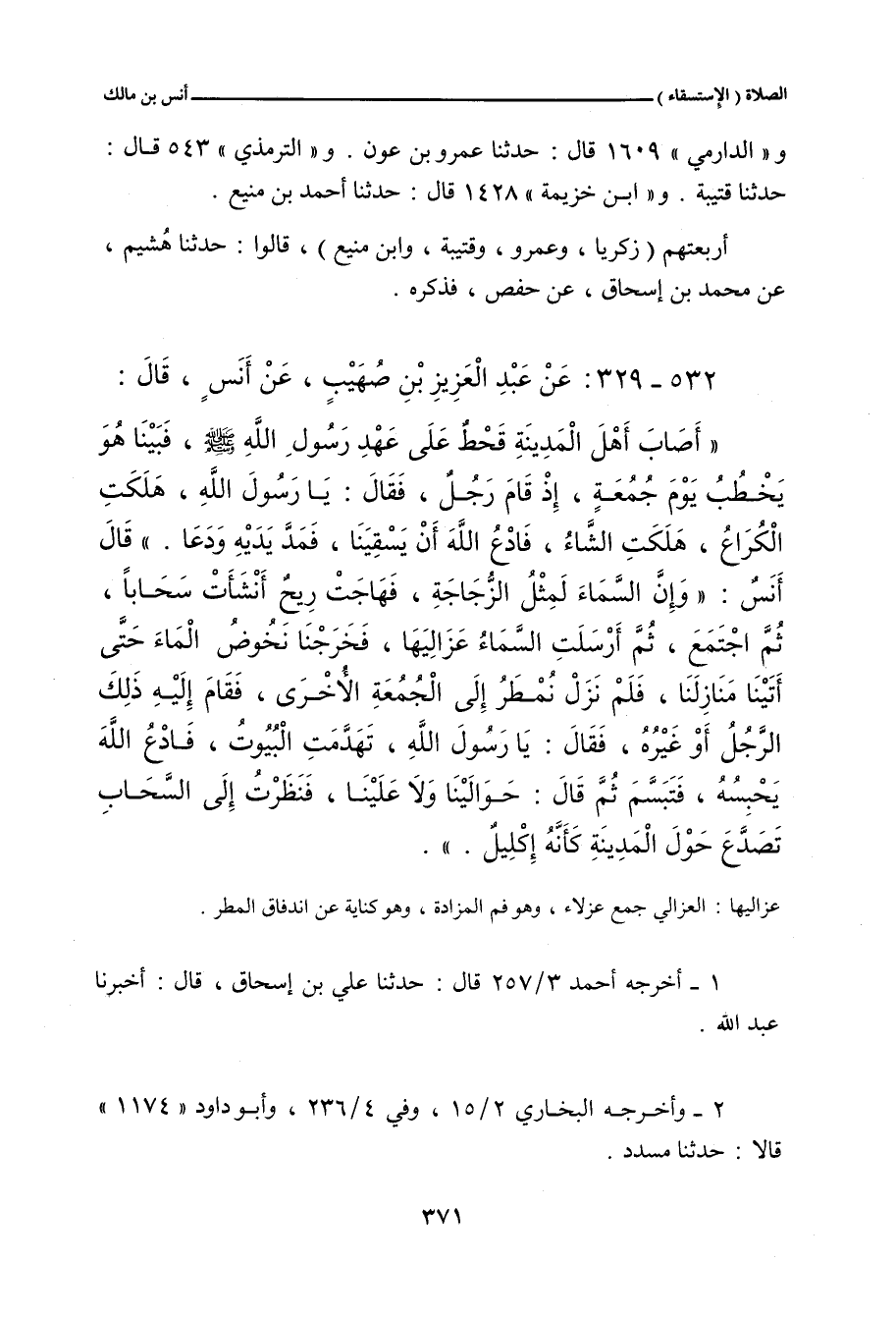 أَصَابَ أَهْلَ الْمَدِينَةِ قَحْطٌ عَلَى عَهْدِ رَسُولِ اللهِ صلى الله عليه وسلم، فَبَيْنَا هُوَ يَخْطُبُ يَوْمَ جُمُعَةٍ، إِذْ قَامَ رَجُلٌ فَقَالَ: يَا رَسُولَ اللهِ، هَلَكَتِ الْكُرَاعُ، هَلَكَتِ الشَّاءُ، فَادْعُ اللَّهَ يَسْقِينَا، فَمَدَّ يَدَيْهِ وَدَعَا، قَالَ أَنَسٌ: وَإِنَّ السَّمَاءَ لَمِثْلُ الزُّجَاجَةِ، فَهَاجَتْ رِيحٌ أَنْشَأَتْ سَحَابًا، ثُمَّ اجْتَمَعَ، ثُمَّ أَرْسَلَتِ السَّمَاءُ عَزَالِيَهَا، فَخَرَجْنَا نَخُوضُ الْمَاءَ حَتَّى أَتَيْنَا مَنَازِلَنَا، فَلَمْ نَزَلْ نُمْطَرُ إِلَى الْجُمُعَةِ الأُخْرَى، فَقَامَ إِلَيْهِ ذَلِكَ الرَّجُلُ، أَوْ غَيْرُهُ، فَقَالَ: يَا رَسُولَ اللهِ، تَهَدَّمَتِ الْبُيُوتُ، فَادْعُ اللَّهَ يَحْبِسْهُ، فَتَبَسَّمَ، ثُمَّ قَالَ: حَوَالَيْنَا وَلَا عَلَيْنَا، فَنَظَرْتُ إِلَى السَّحَابِ تَصَدَّعَ حَوْلَ الْمَدِينَةِ كَأَنَّهُ إِكْلِيلٌ.