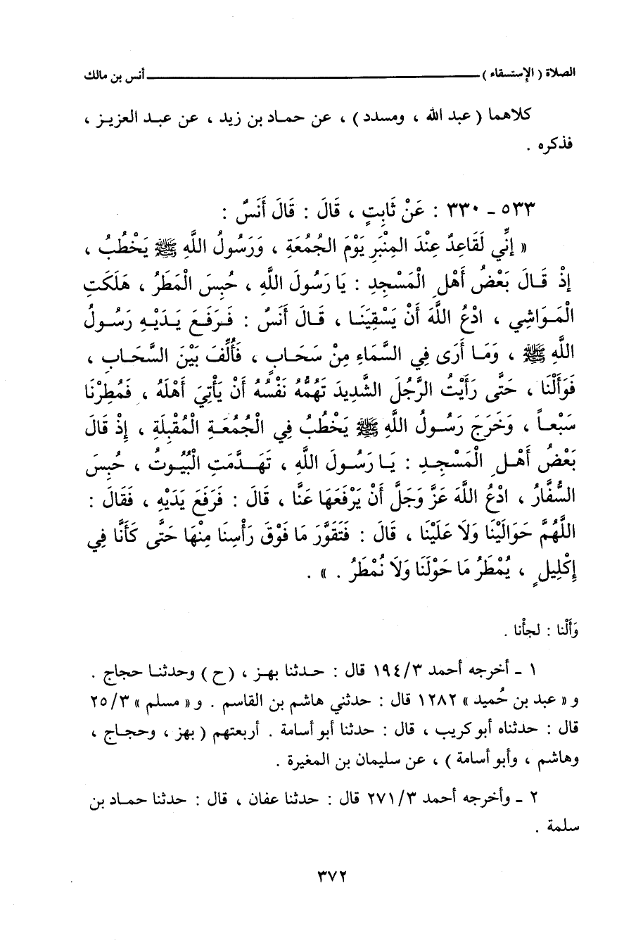 إِنِّي لَقَاعِدٌ عِنْدَ الْمِنْبَرِ، يَوْمَ الْجُمُعَةِ، وَرَسُولُ اللهِ صلى الله عليه وسلم يَخْطُبُ، إِذْ قَالَ بَعْضُ أَهْلِ الْمَسْجِدِ: يَا رَسُولَ اللهِ، حُبِسَ الْمَطَرُ، هَلَكَتِ الْمَوَاشِي، ادْعُ اللَّهَ أَنْ يَسْقِيَنَا. قَالَ أَنَسٌ: فَرَفَعَ يَدَيْهِ رَسُولُ اللهِ صلى الله عليه وسلم، وَمَا أَرَى فِي السَّمَاءِ مِنْ سَحَابٍ، فَأُلِّفَ بَيْنَ السَّحَابِ (قَالَ حَجَّاجٌ: فَأَلَّفَ اللَّهُ بَيْنَ السَّحَابِ)، فَوَأَلْنَا (قَالَ حَجَّاجٌ: سَعَيْنَا) حَتَّى رَأَيْتُ الرَّجُلَ الشَّدِيدَ تَهُمُّهُ نَفْسُهُ أَنْ يَأْتِيَ أَهْلَهُ، فَمُطِرْنَا سَبْعًا، وَخَرَجَ رَسُولُ اللهِ صلى الله عليه وسلم يَخْطُبُ فِي الْجُمُعَةِ الْمُقْبِلَةِ، إِذْ قَالَ بَعْضُ أَهْلِ الْمَسْجِدِ: يَا رَسُولَ اللهِ، تَهَدَّمَتِ الْبُيُوتُ، حُبِسَ السُّفَّارُ، ادْعُ اللَّهَ، عَزَّ وَجَلَّ، أَنْ يَرْفَعَهَا عَنَّا، قَالَ: فَرَفَعَ يَدَيْهِ، فَقَالَ: اللَّهُمَّ حَوَالَيْنَا وَلَا عَلَيْنَا، قَالَ: فَتَقَوَّرَ مَا فَوْقَ رَأْسِنَا مِنْهَا، حَتَّى كَأَنَّا فِي إِكْلِيلٍ، يُمْطَرُ مَا حَوْلَنَا وَلَا نُمْطَرُ.