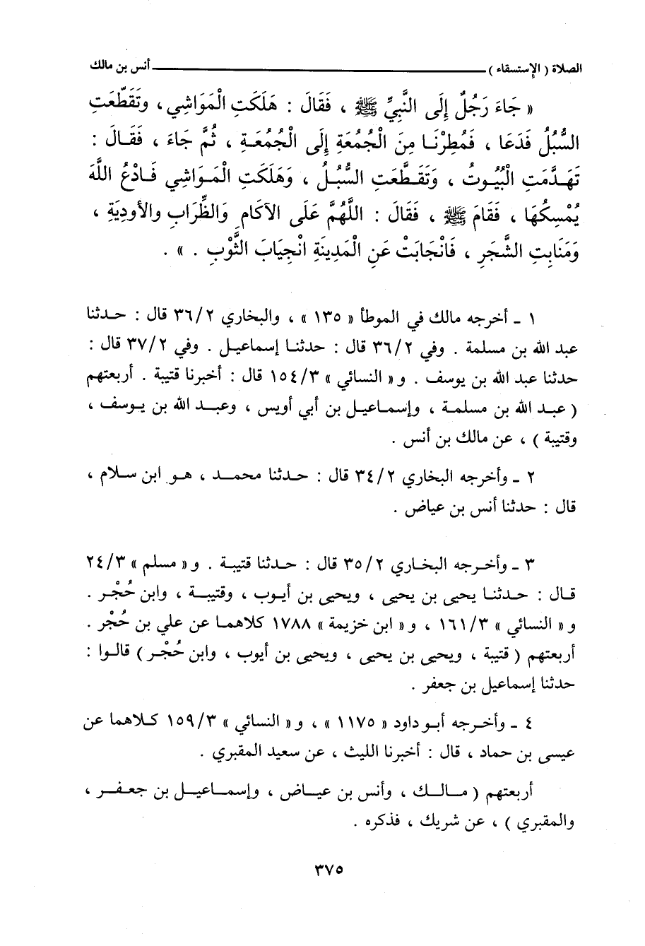 - وفي رواية: أَنَّ رَجُلاً دَخَلَ الْمَسْجِدَ، يَوْمَ جُمُعَةٍ، مِنْ بَابٍ كَانَ نَحْوَ دَارِ الْقَضَاءِ، وَرَسُولُ اللهِ صلى الله عليه وسلم قَائِمٌ يَخْطُبُ، فَاسْتَقْبَلَ رَسُولَ اللهِ صلى الله عليه وسلم قَائِمًا، ثُمَّ قَالَ: يَا رَسُولَ اللهِ، هَلَكَتِ الأَمْوَالُ، وَانْقَطَعَتِ السُّبُلُ، فَادْعُ اللَّهَ يُغِيثُنَا، فَرَفَعَ رَسُولُ اللهِ صلى الله عليه وسلم يَدَيْهِ، ثُمَّ قَالَ: اللَّهُمَّ أَغِثْنَا، اللَّهُمَّ أَغِثْنَا، اللَّهُمَّ أَغِثْنَا. قَالَ أَنَسٌ: وَلَا وَاللهِ، مَا نَرَى فِي السَّمَاءِ مِنْ سَحَابٍ، وَلَا قَزَعَةً، وَمَا بَيْنَنَا وَبَيْنَ سَلْعٍ مِنْ بَيْتٍ وَلَا دَارٍ، قَالَ: فَطَلَعَتْ مِنْ وَرَائِهِ سَحَابَةٌ مِثْلُ التُّرْسِ، فَلَمَّا تَوَسَّطَتِ السَّمَاءَ انْتَشَرَتْ، ثُمَّ أَمْطَرَتْ، فَلَا وَاللهِ، مَا رَأَيْنَا الشَّمْسَ سِتًّا، ثُمَّ دَخَلَ رَجُلٌ مِنْ ذَلِكَ الْبَابِ، فِي الْجُمُعَةِ، وَرَسُولُ اللهِ صلى الله عليه وسلم قَائِمٌ يَخْطُبُ، فَاسْتَقْبَلَهُ قَائِمًا، فَقَالَ: يَا رَسُولَ اللهِ، هَلَكَتِ الأَمْوَالُ، وَانْقَطَعَتِ السُّبُلُ، فَادْعُ اللَّهَ يُمْسِكْهَا عَنَّا، قَالَ: فَرَفَعَ رَسُولُ اللهِ صلى الله عليه وسلم يَدَيْهِ، ثُمَّ قَالَ: اللَّهُمَّ حَوَالَيْنَا وَلَا عَلَيْنَا، اللَّهُمَّ عَلَى الآكَامِ، وَالظِّرَابِ، وَبُطُونِ الأَوْدِيَةِ، وَمَنَابِتِ الشَّجَرِ، قَالَ: فَأَقْلَعَتْ، وَخَرَجْنَا نَمْشِي فِي الشَّمْسِ.